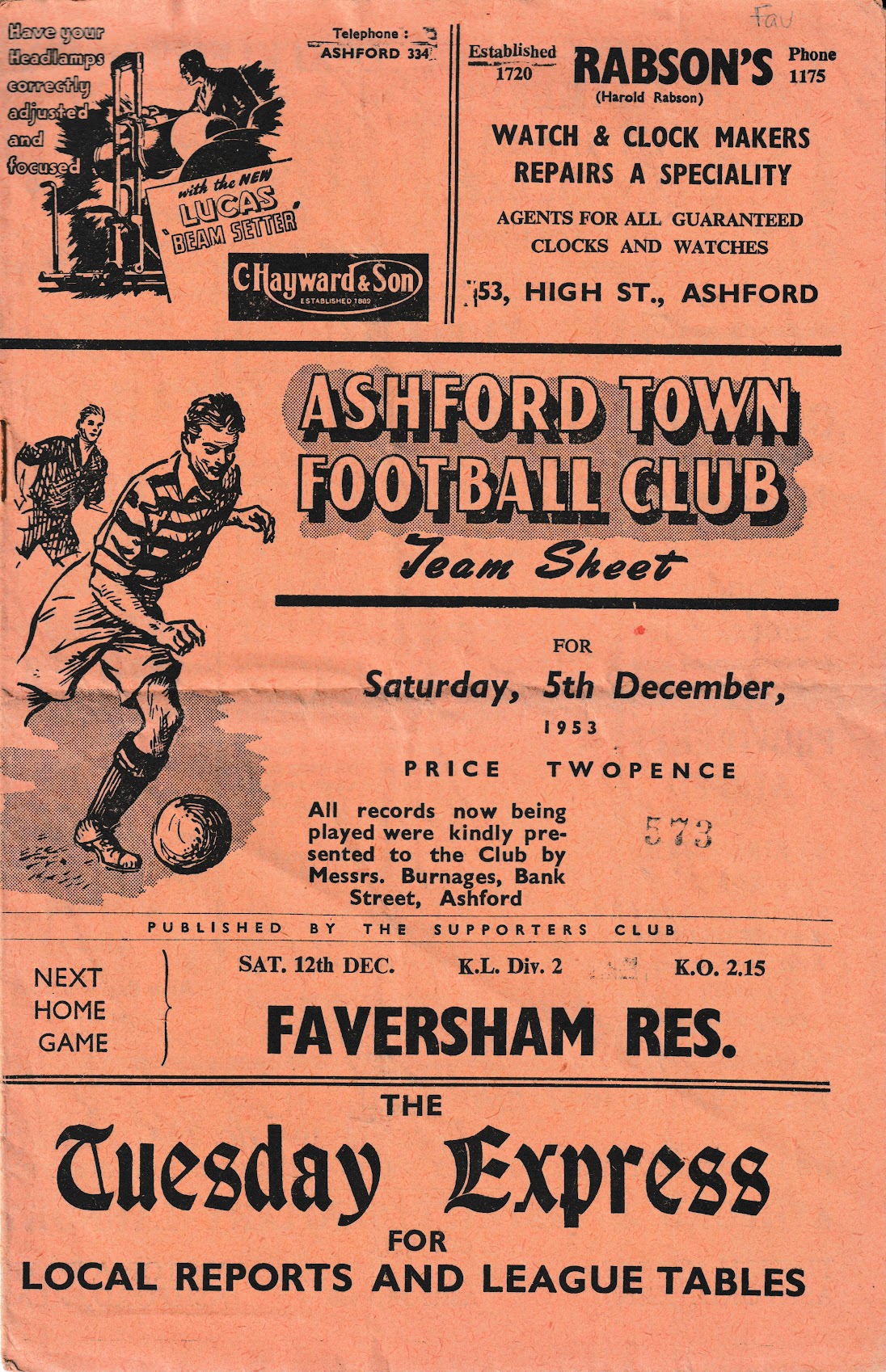 Faversham Town (H), 1953/54