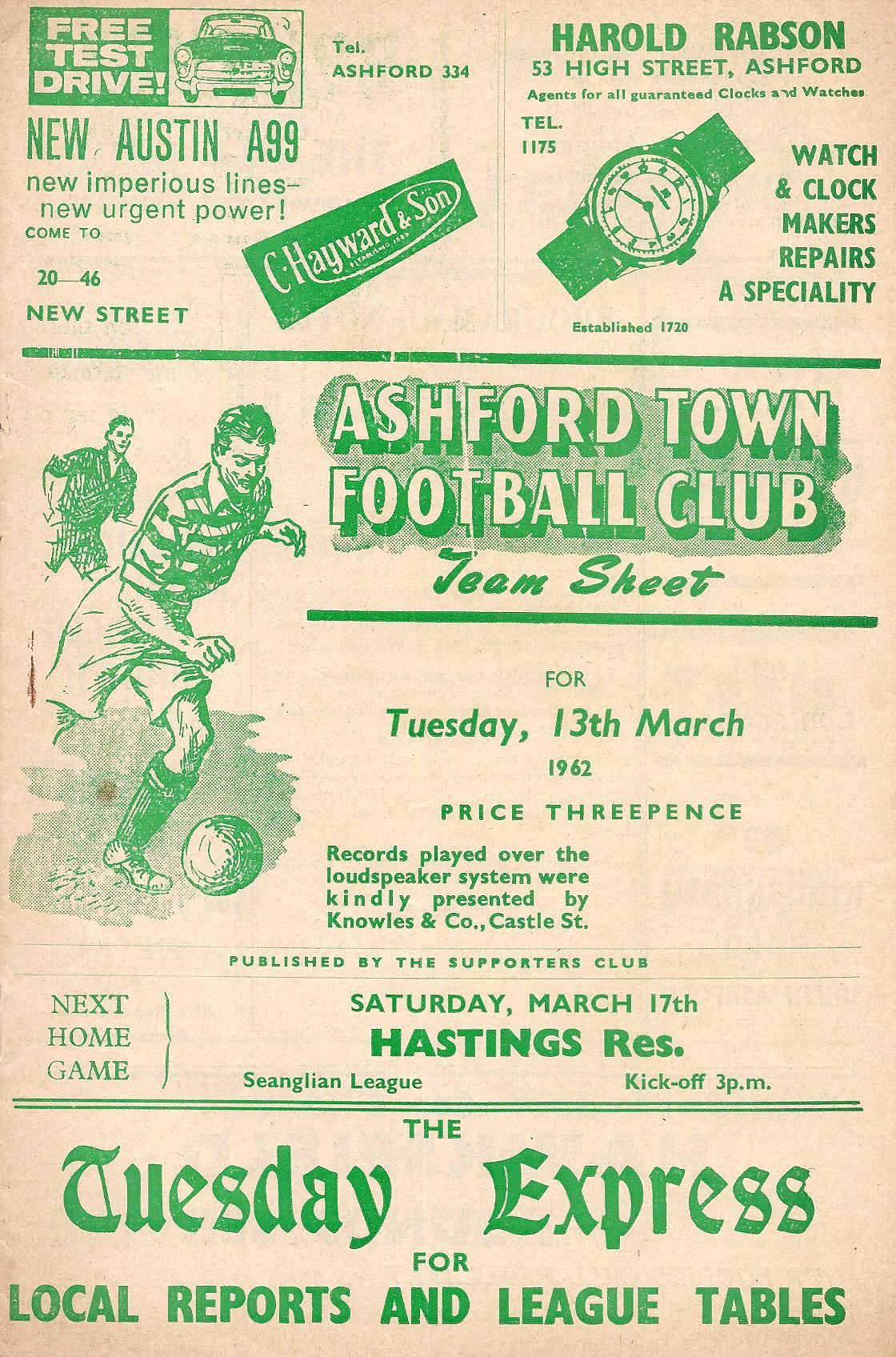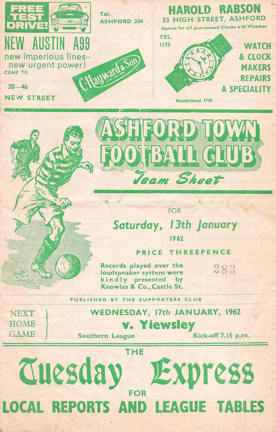 13 Jan 1962 Beckenham Town (H) 1st Round 3-1 776 Programme