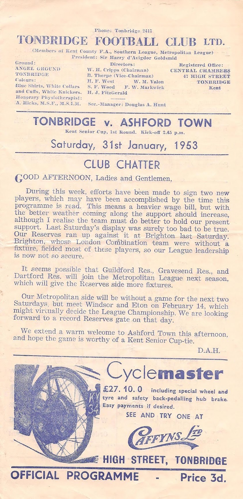 31 Jan 1953 Tonbridge (A) 1st Round 0-0 --- Programme