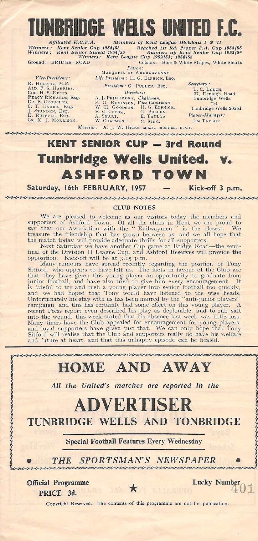 29 Jan 1955 Tonbridge (A) 2nd Round 0-2 3,316 Programme