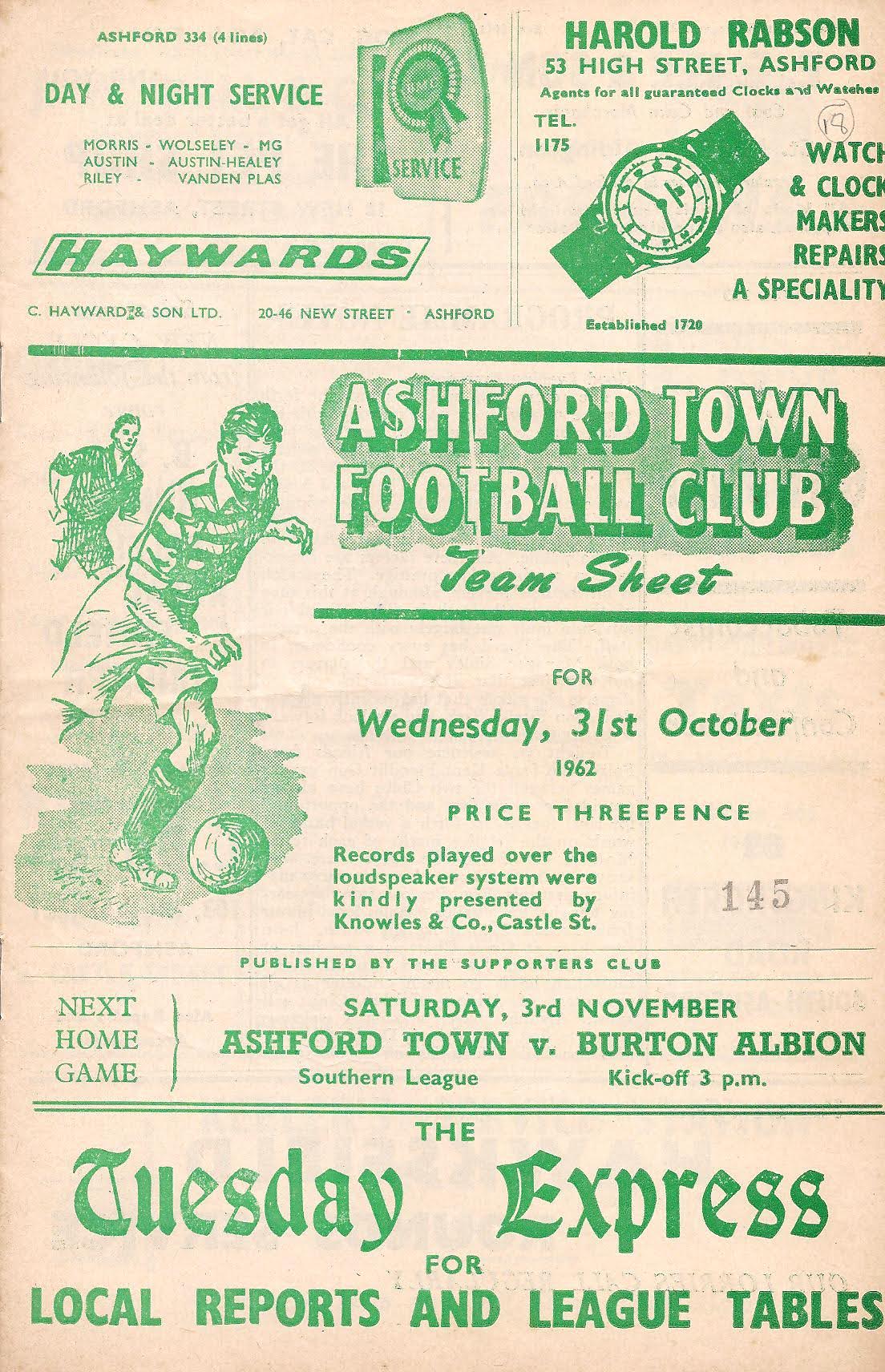 31 Oct 1962 Folkestone Town (H) Group Stage 1-2 700 Programme