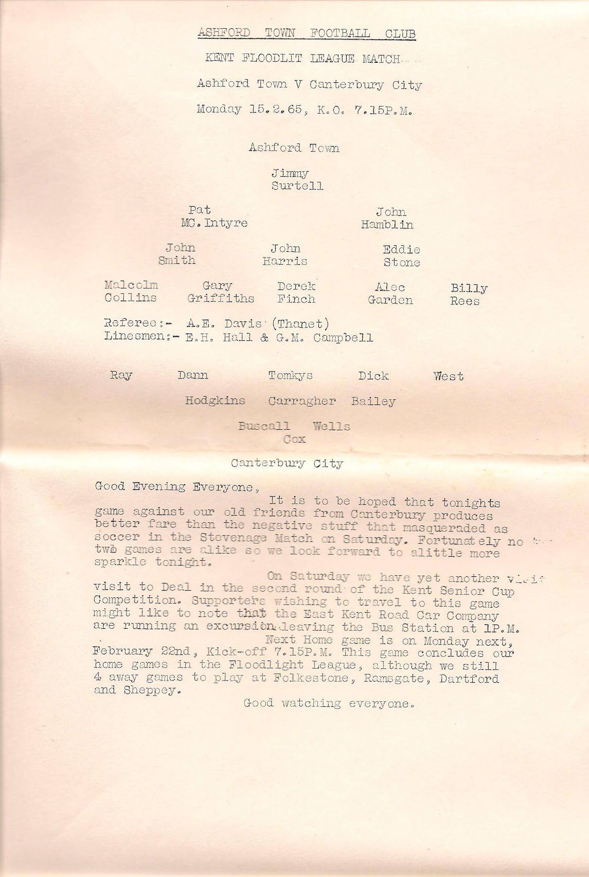 15 Feb 1965 Canterbury City (H) Group Stage 2-1 424 Programme