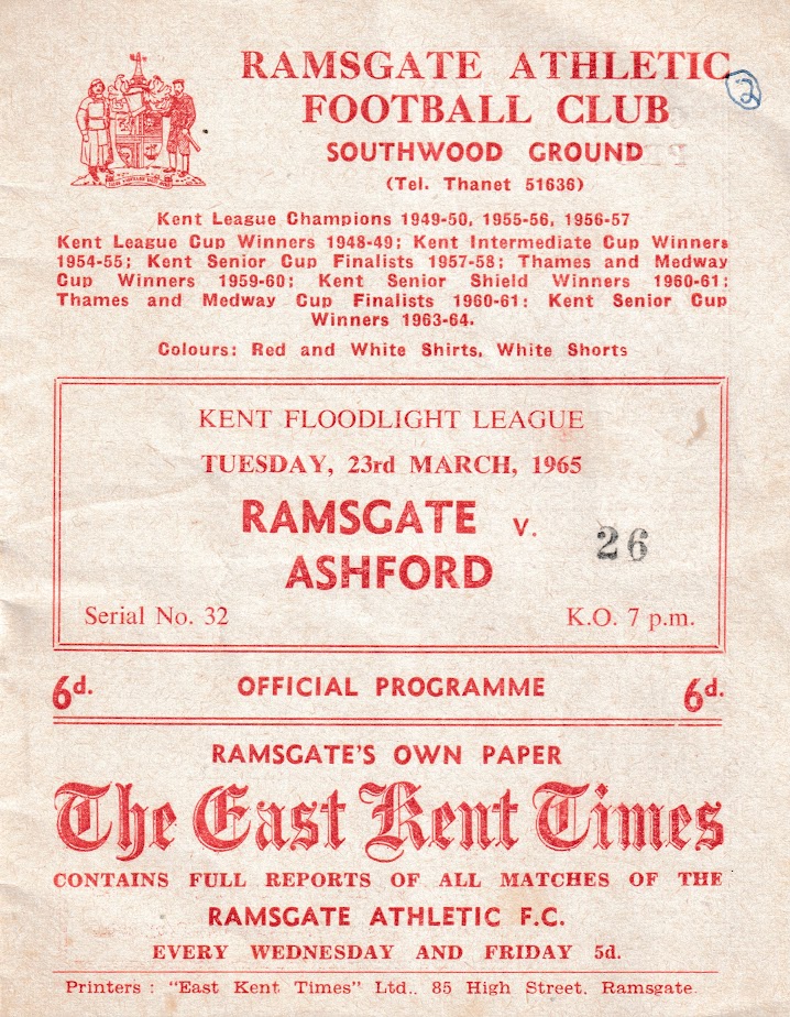 23 Mar 1965 Ramsgate Athletic (A) Group Stage 0-2 393 Programme