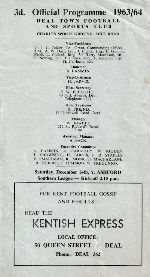 1963/64 14 Dec 1963 Deal Town (A) Southern League Division One 1-1 286 Programme
