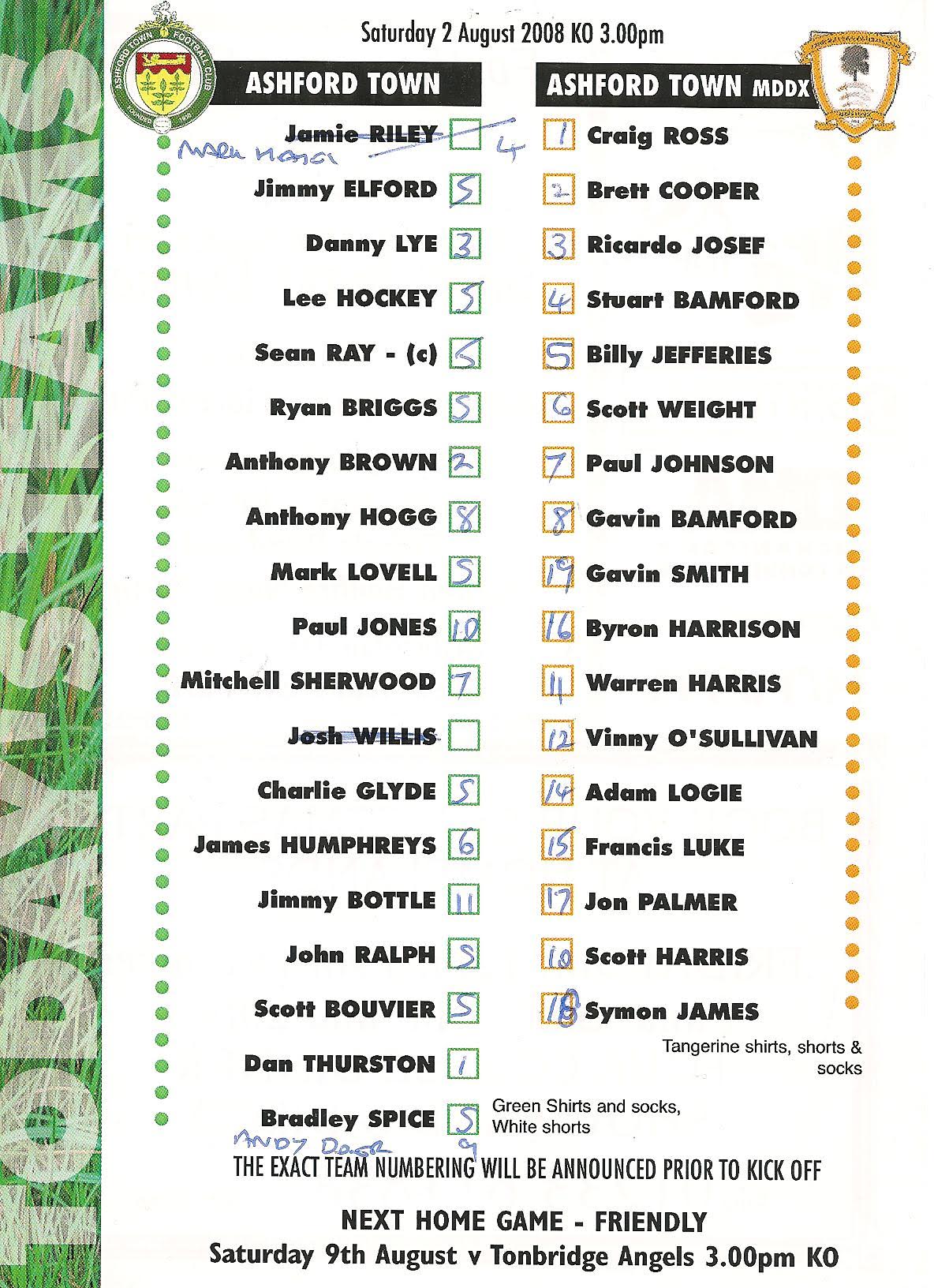 2008/09 02 Aug 2008 Ashford Town (Middlesex) (H) Friendly --- --- Programme