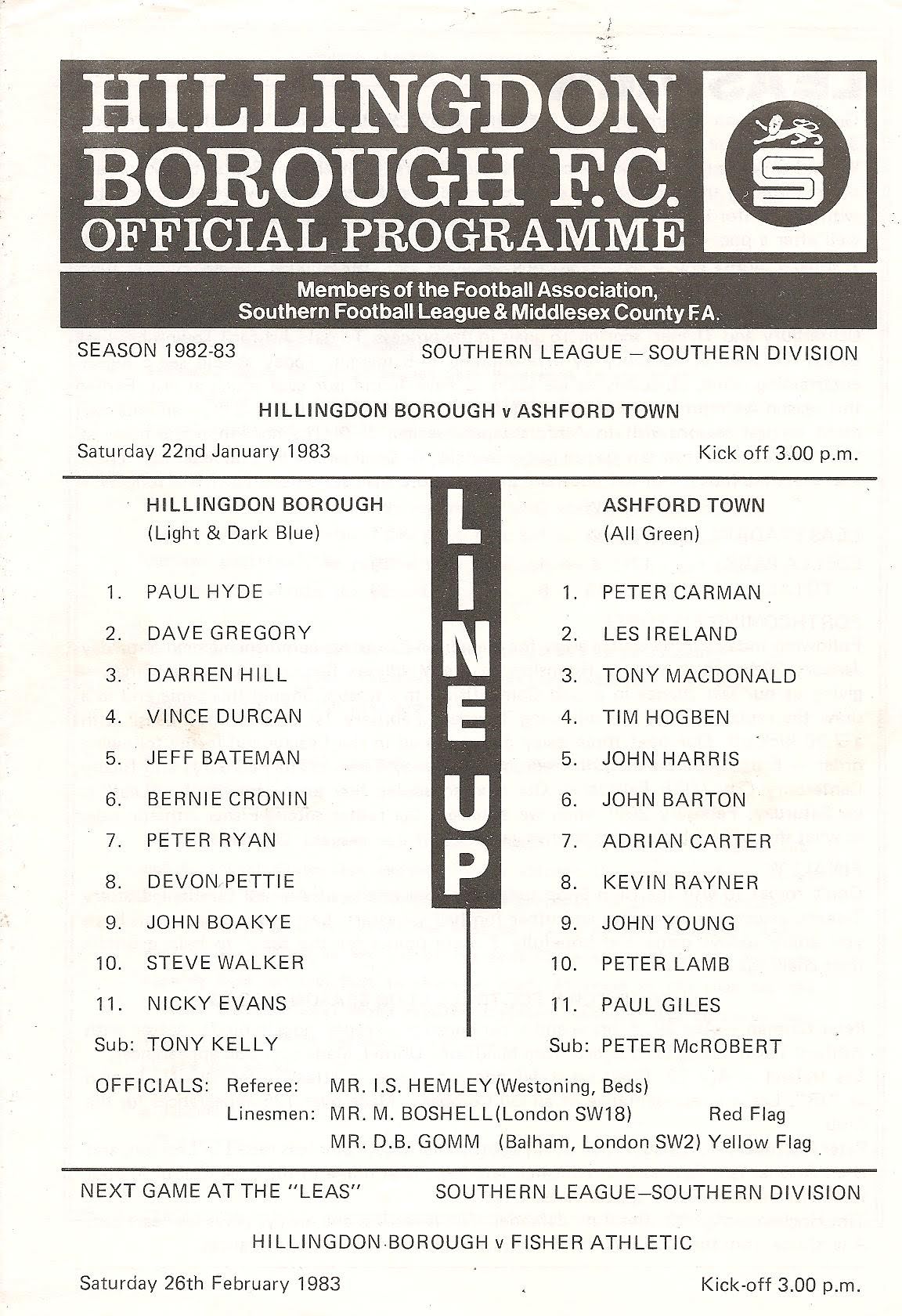 1982/83 22 Jan 1983 Hillingdon Borough (A) Southern League Southern Division 0-1 --- Programme