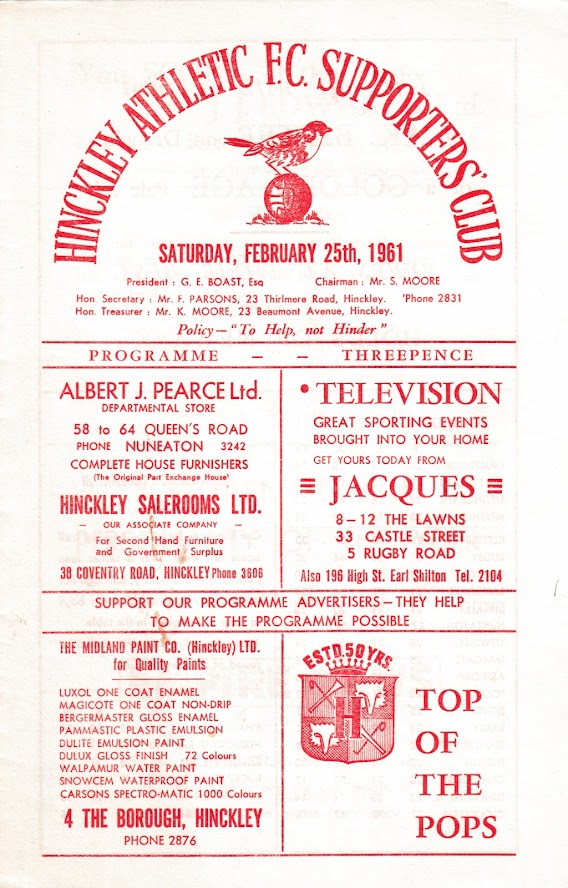 1960/61 25 Feb 1961 Hinckley Athletic (A) Southern League Division One 3-5 451 Programme