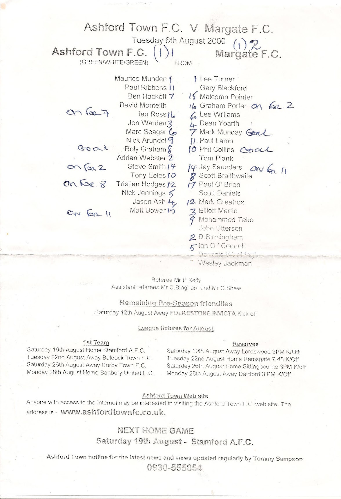 2000/01 06 Aug 2000 Margate (H) Friendly 1-2 --- Programme