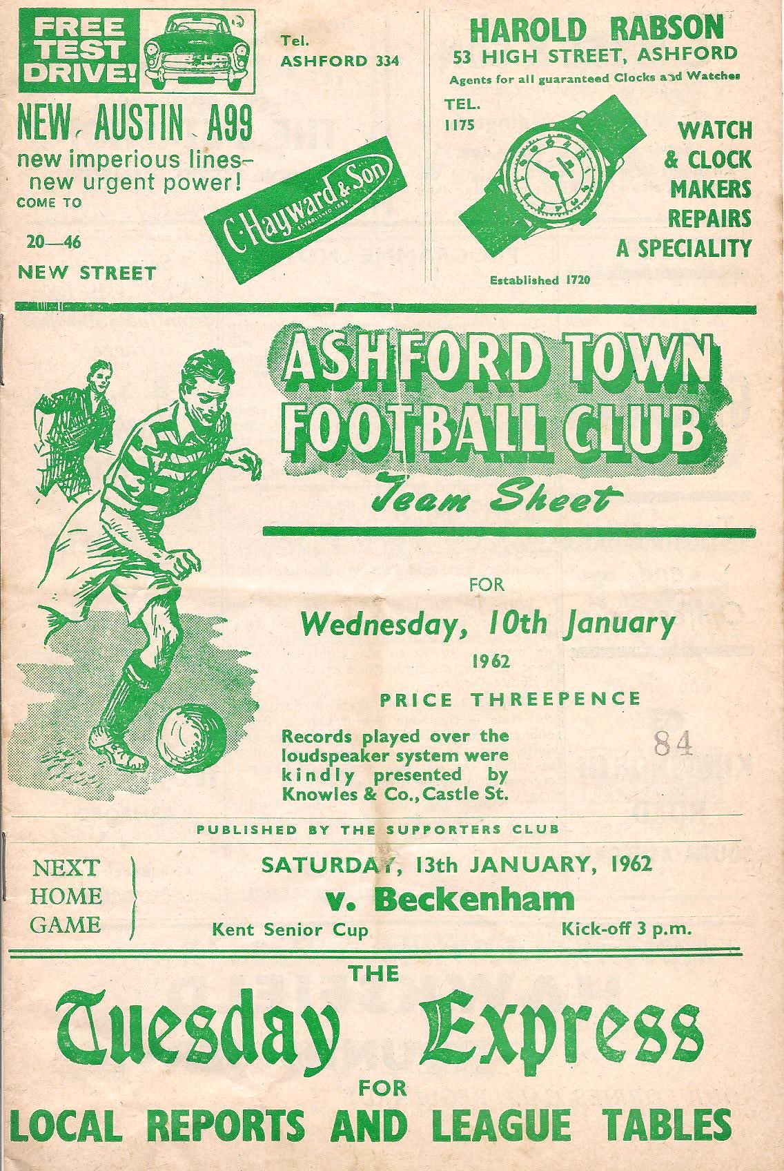 1961/62 10 Jan 1962 Ramsgate Athletic (H) Kent Floodlight Cup 2-0 --- Programme