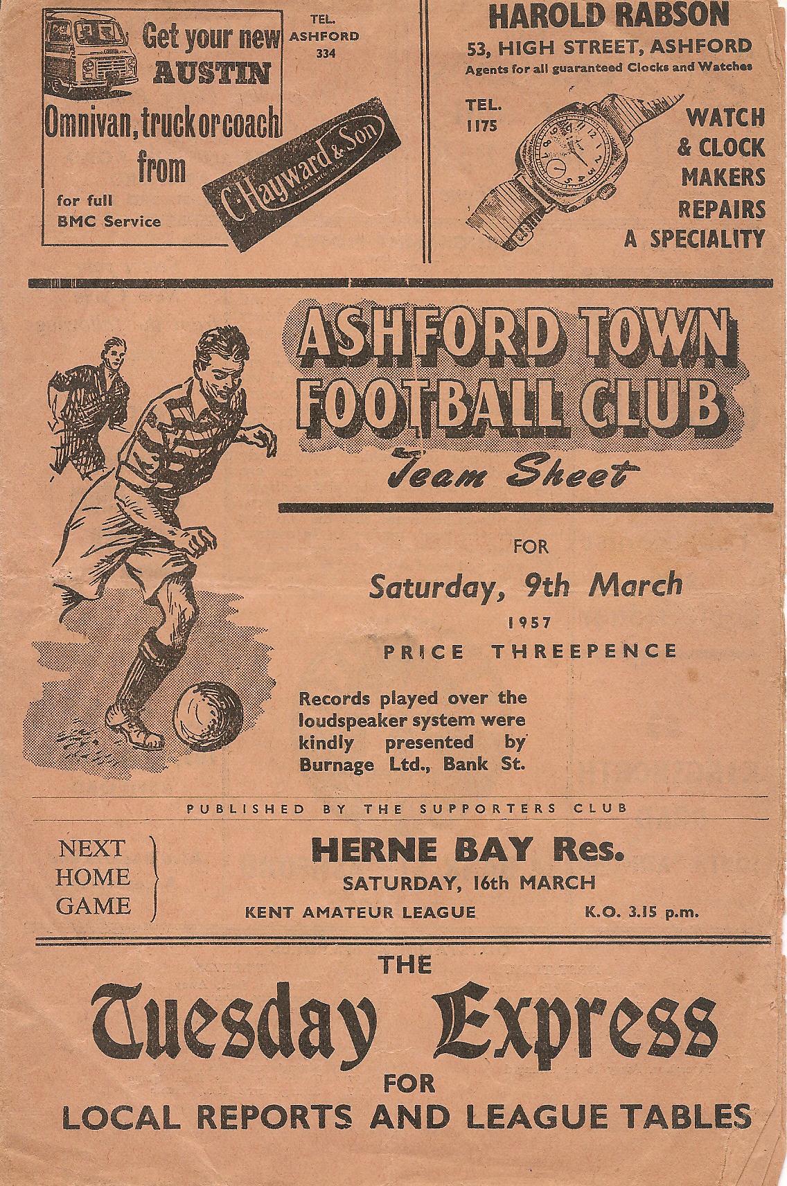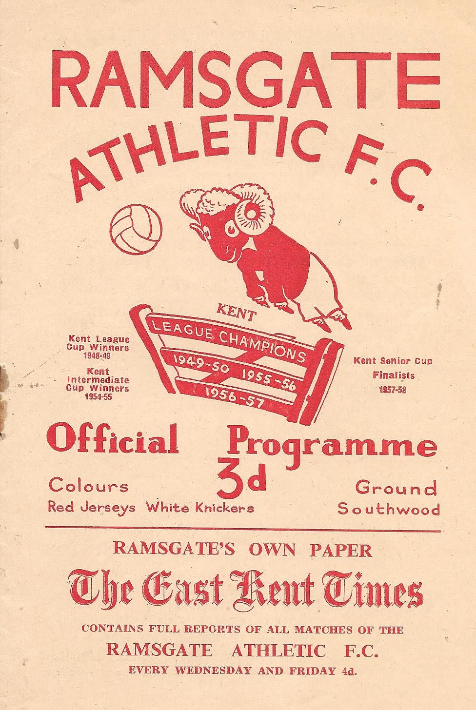 1957/58 29 Mar 1958 Ramsgate Athletic (H) Kent League Division 1 5-3 1,124 Programme