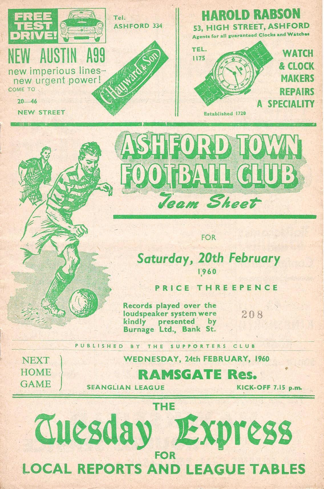 1959/60 20 Feb 1960 Ramsgate Athletic (H) Southern League Division One 1-1 975 Programme