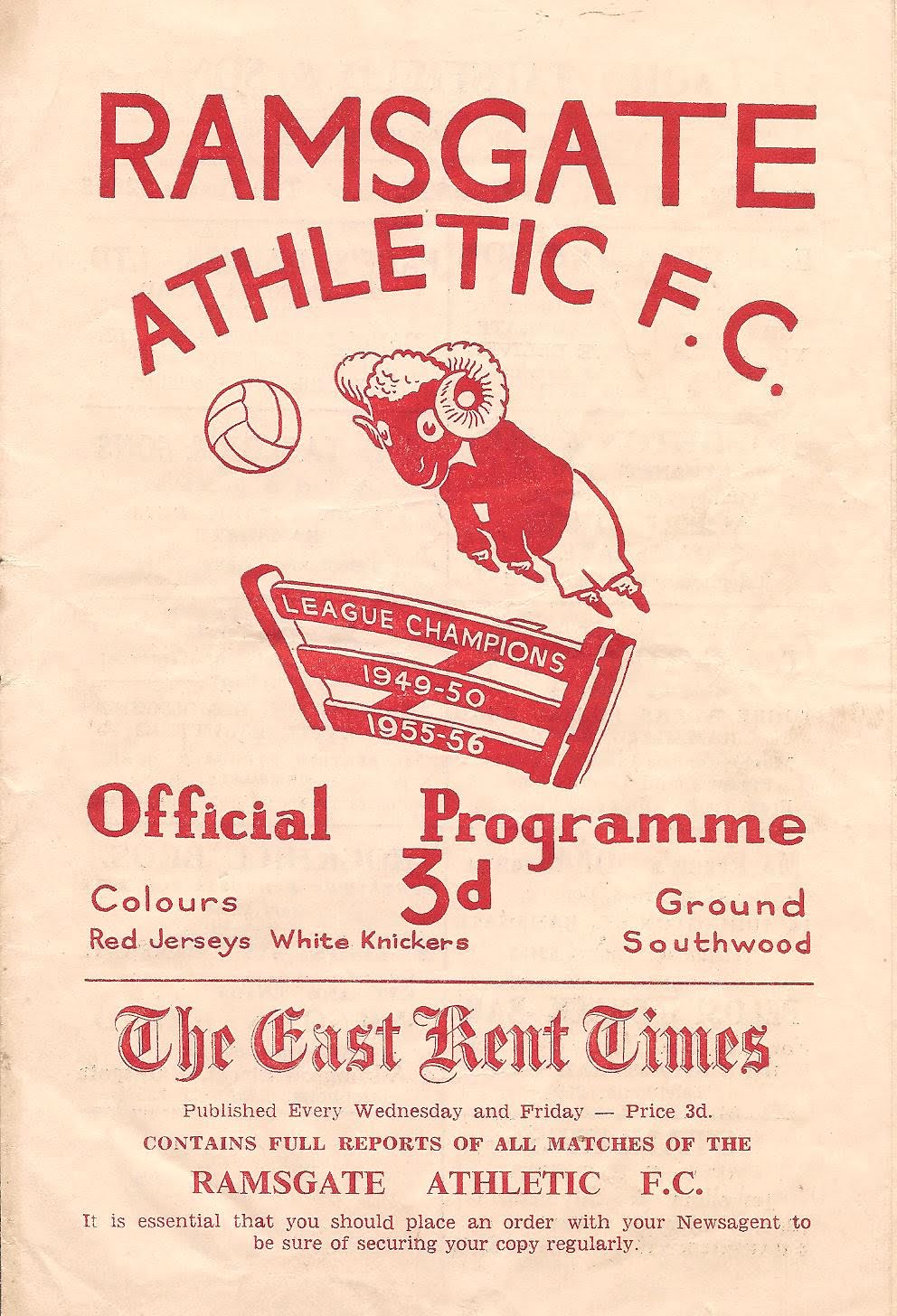 1949/50 25 Mar 1950 Ramsgate Athletic (H) Kent League Division 1 3-5 2,000 Programme