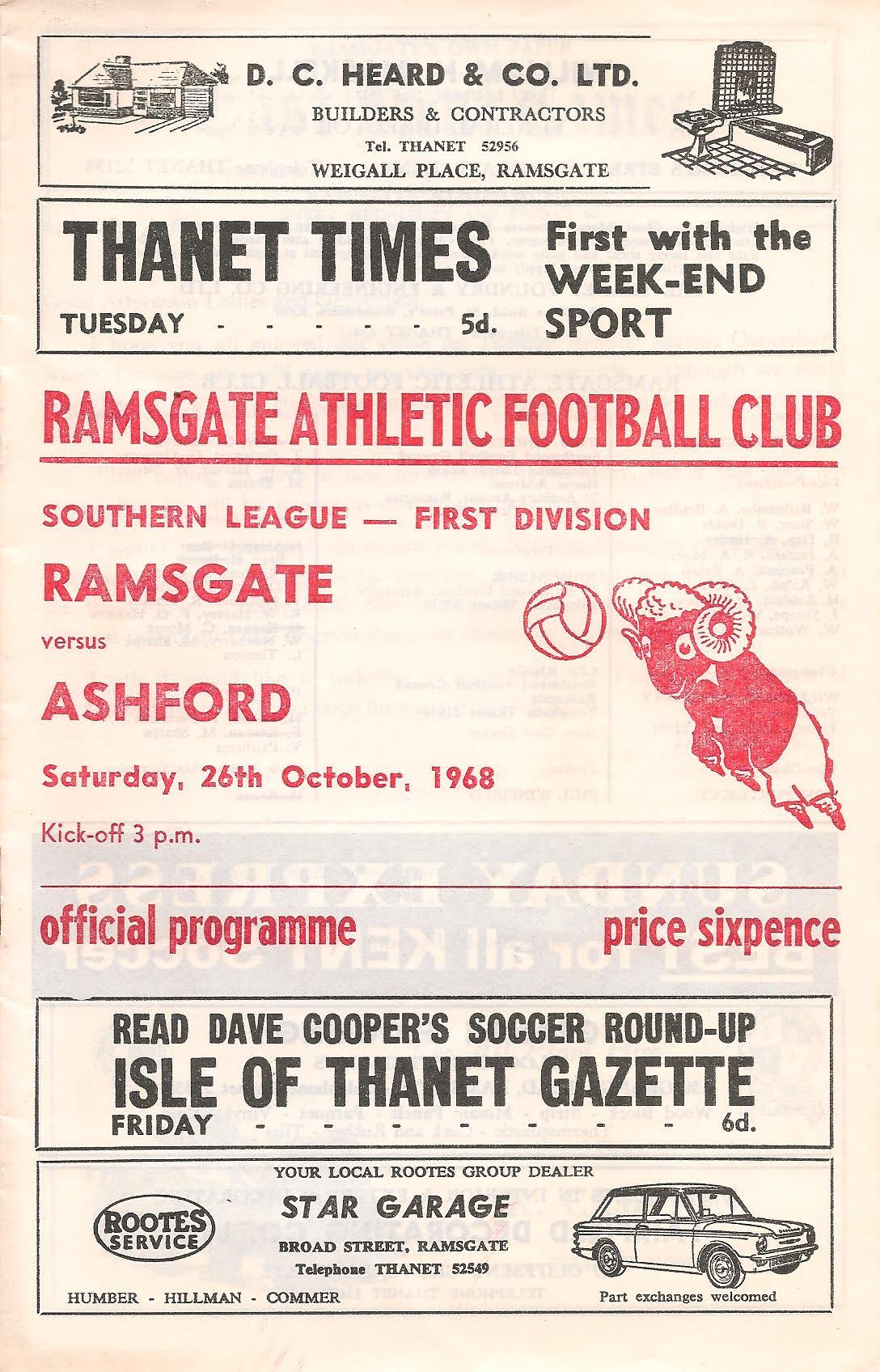 1968/69 26 Oct 1968 Ramsgate Athletic (A) Southern League Division One 1-5 930 Programme