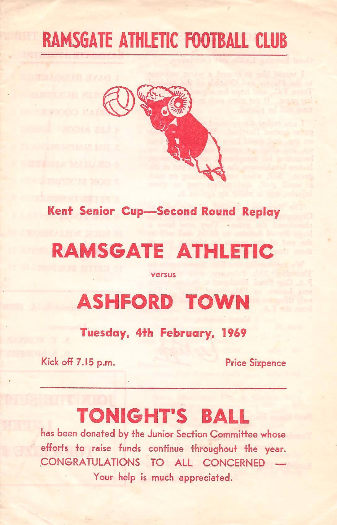 1963/64 18 Dec 1963 Ramsgate Athletic (H) Kent Floodlight Cup 4-1 400 Programme