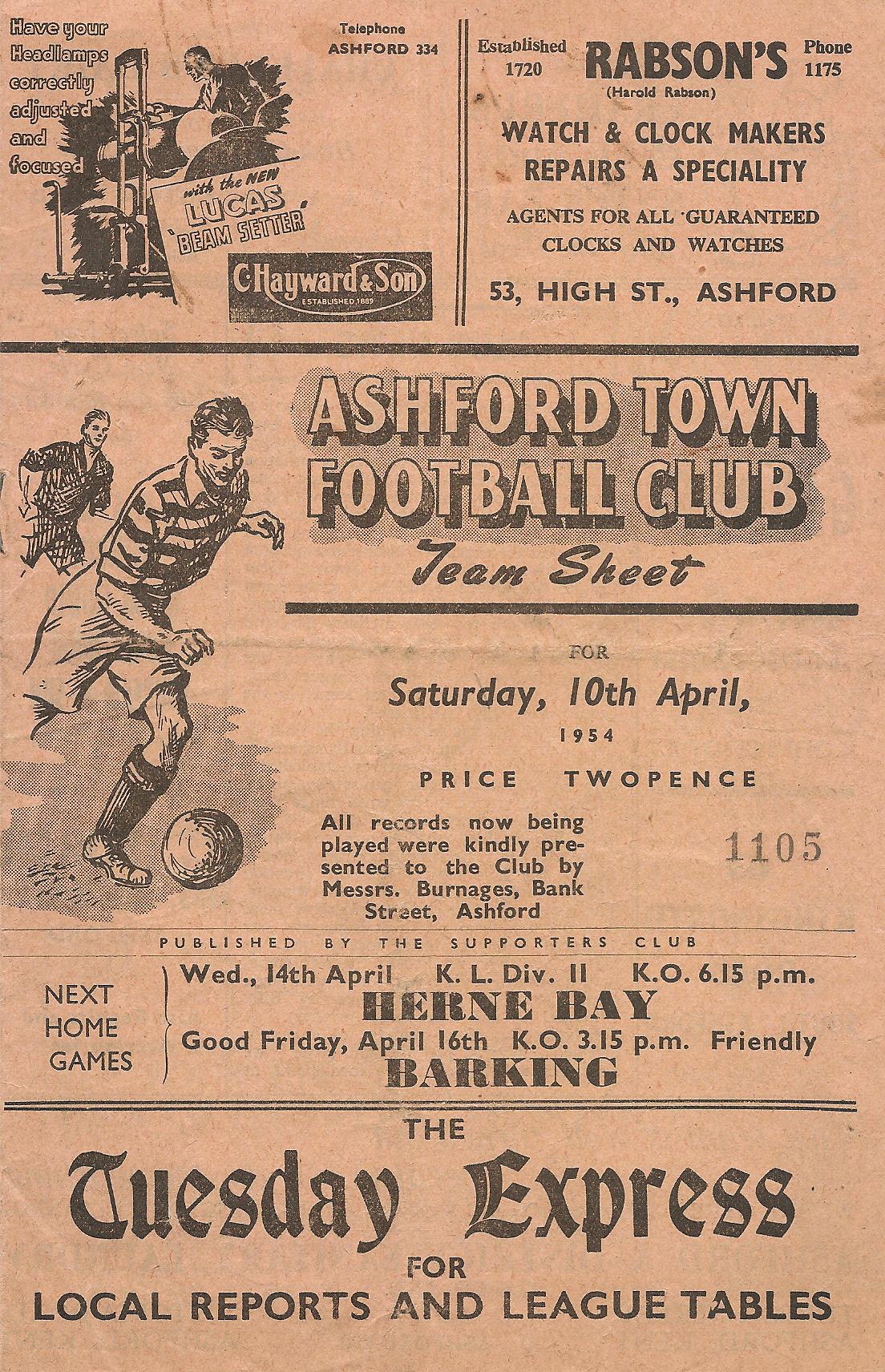 1953/54 10 Apr 1954 Sheppey United (H) Kent League Division 1 1-1 1,168 Programme