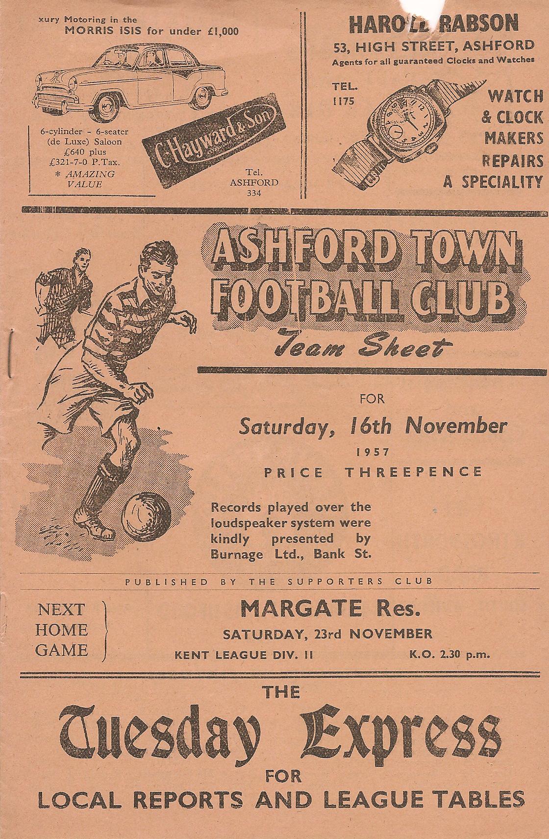 1957/58 16 Nov 1957 Sheppey United (H) Kent League Division 1 5-2 --- Programme