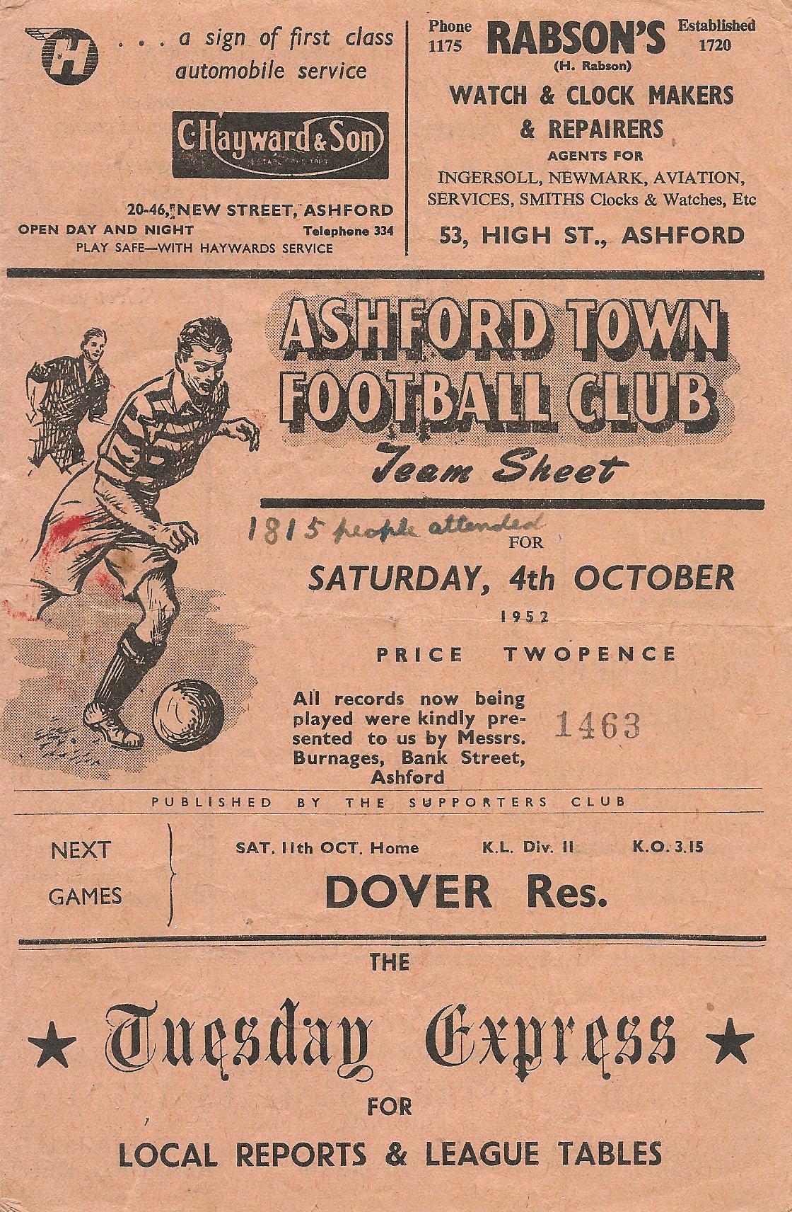 1952/53 04 Oct 1952 Sheppey United (H) Kent League Division 1 2-3 1,815 Programme