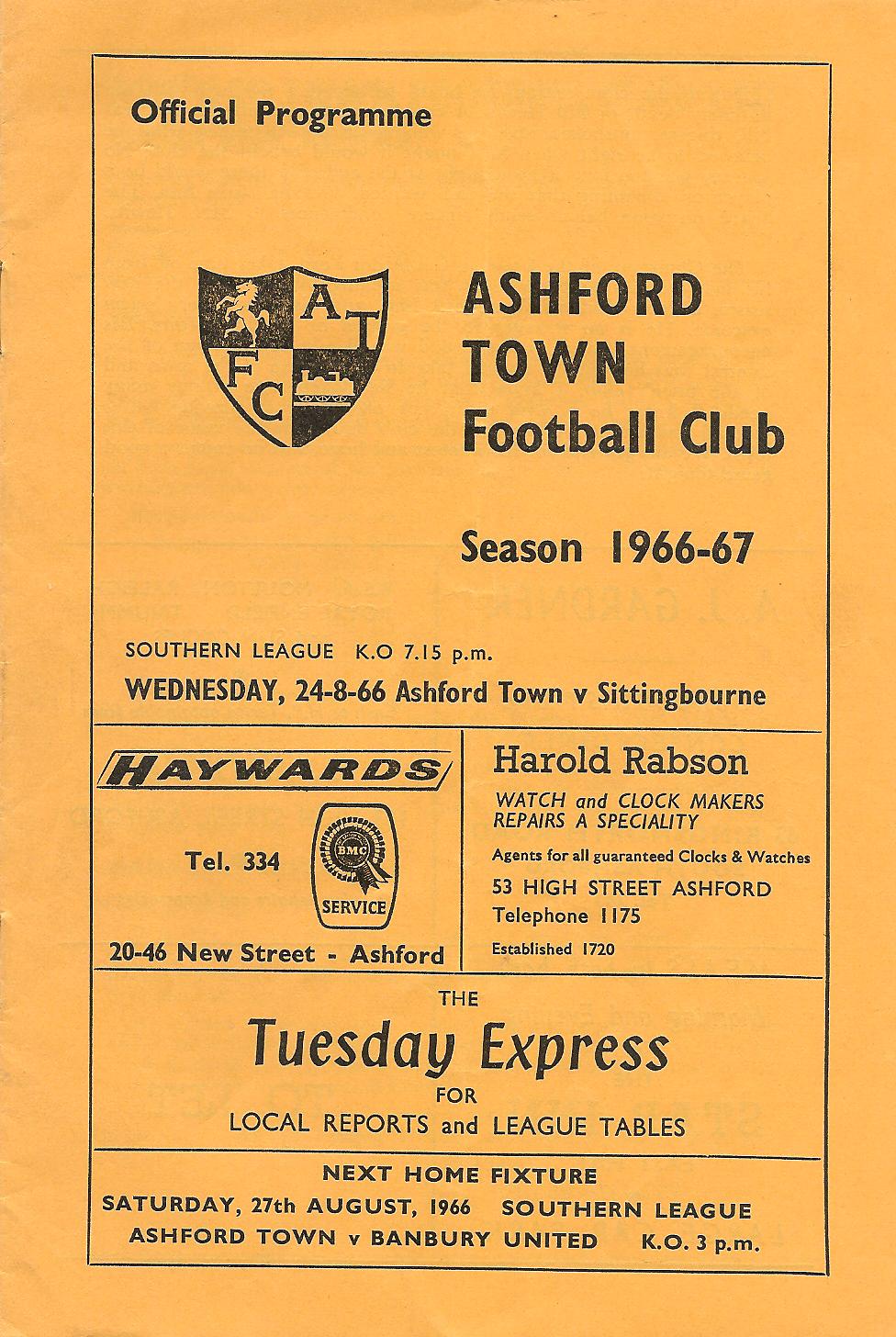 1966/67 24 Aug 1966 Sittingbourne (H) Southern League Division One 0-0 937 Programme
