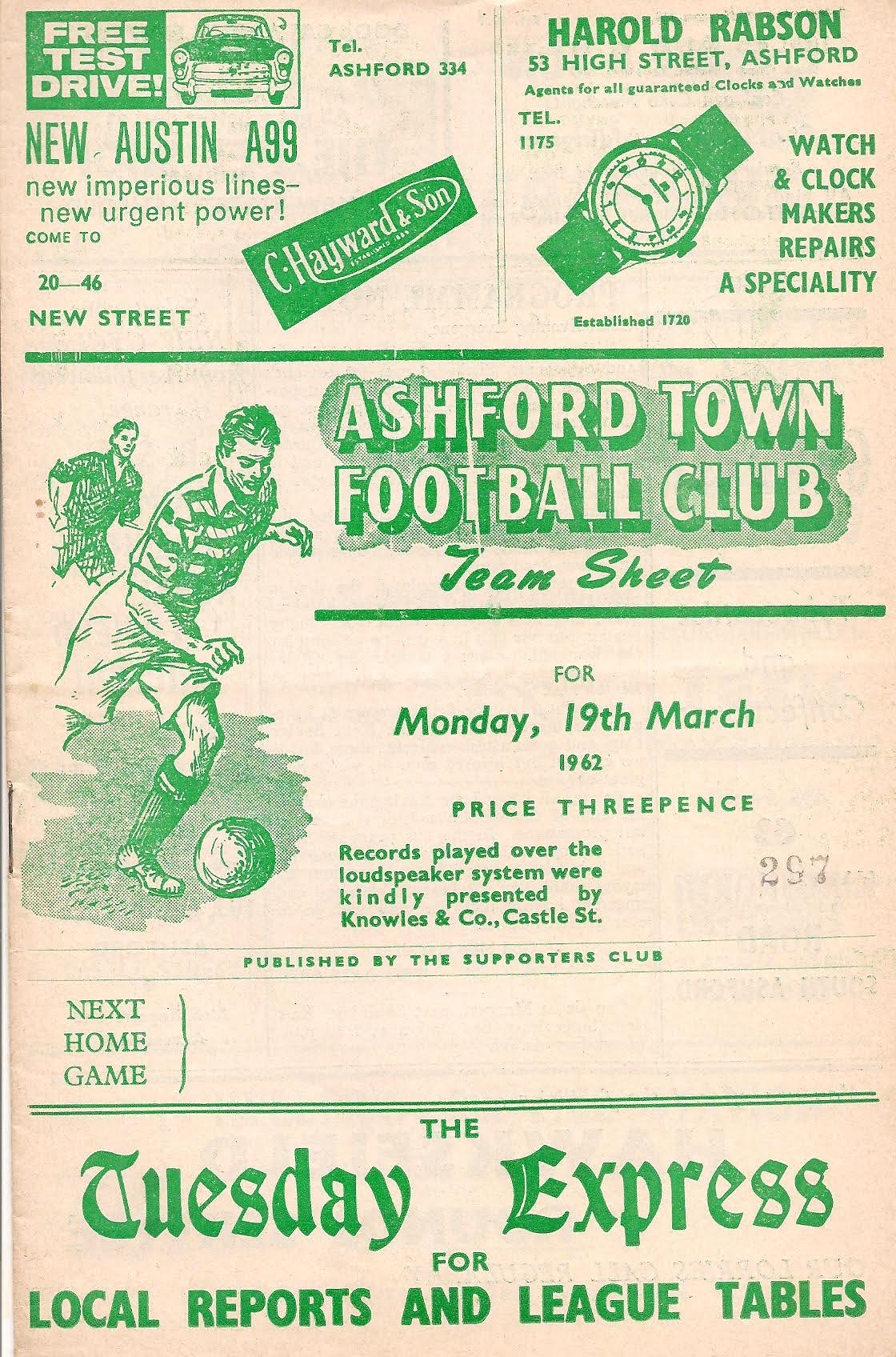 1961/62 19 Mar 1962 Sittingbourne (H) Southern League Division One 4-1 1,012 Programme