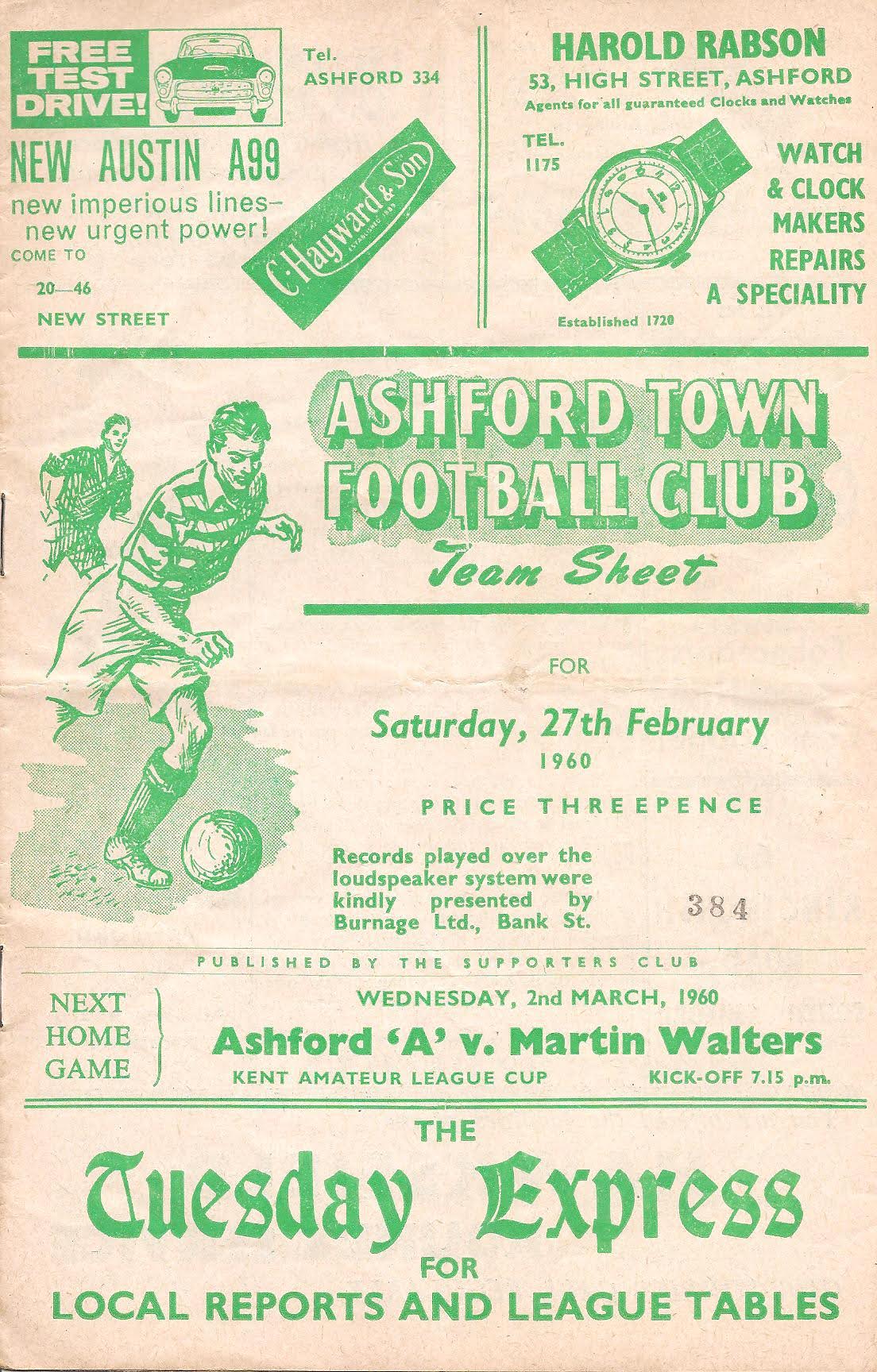 1959/60 27 Feb 1960 Sittingbourne (H) Southern League Division One 2-0 1,445 Programme