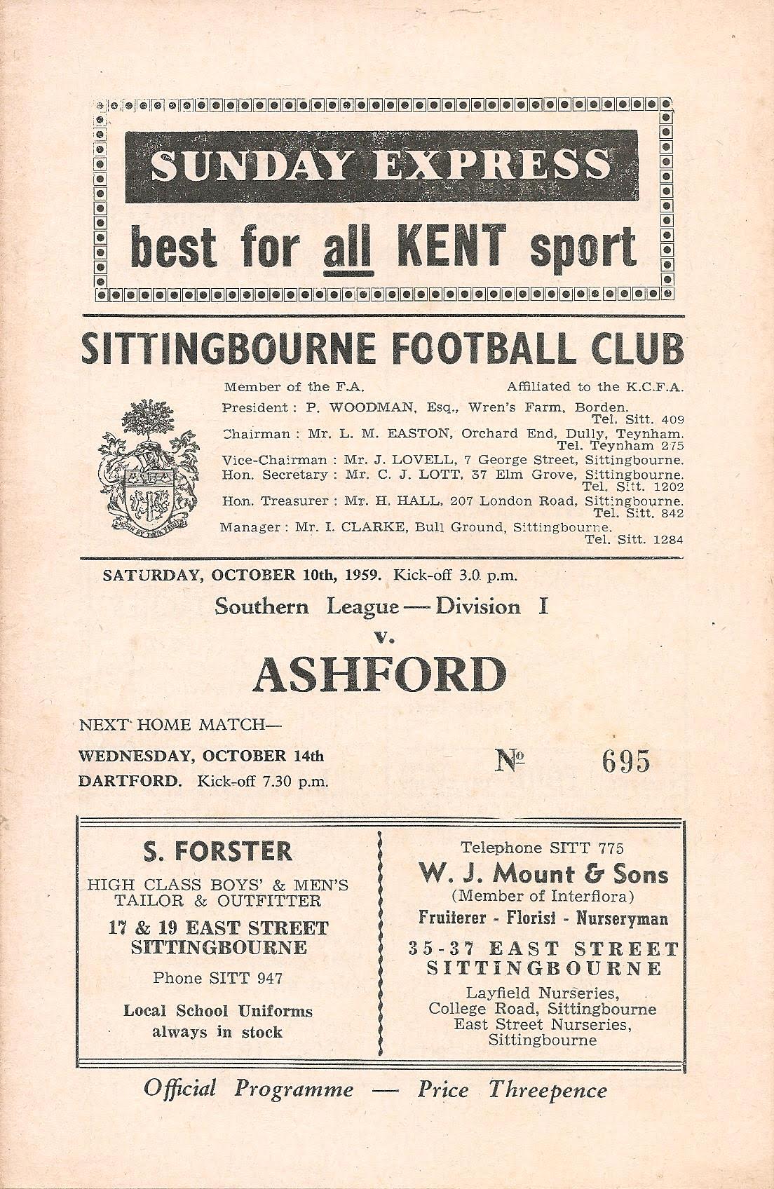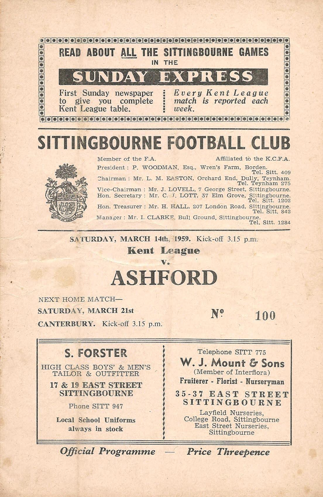 1958/59 14 Mar 1959 Sittingbourne (A) Kent League Division 1 0-1 --- Programme