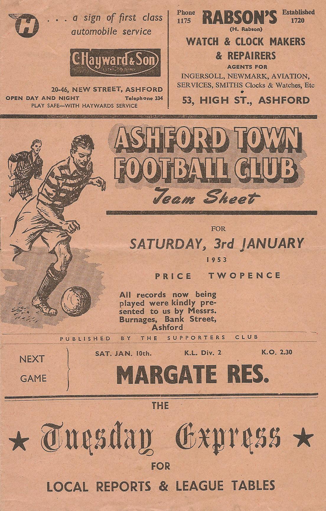 1952/53 03 Jan 1953 Sittingbourne (H) Kent League Division 1 3-3 1,643 Programme