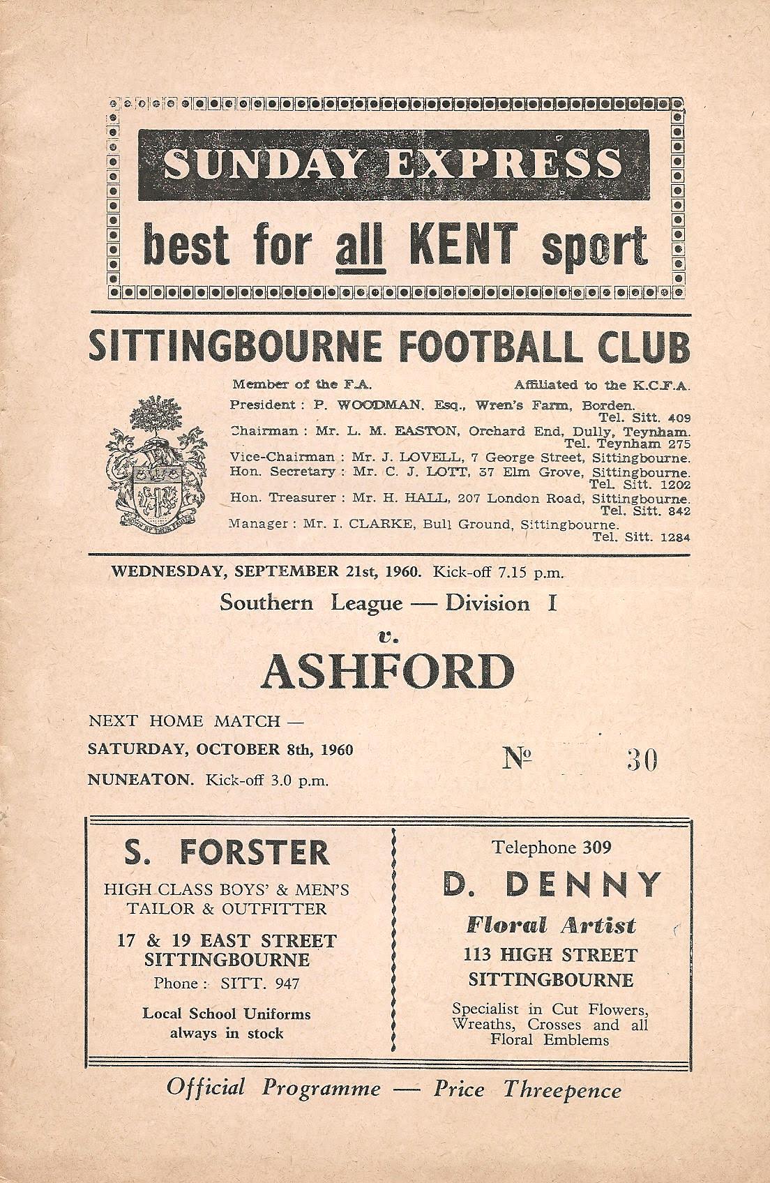 1960/61 21 Sep 1960 Sittingbourne (A) Southern League Division One 0-2 2,500 Programme