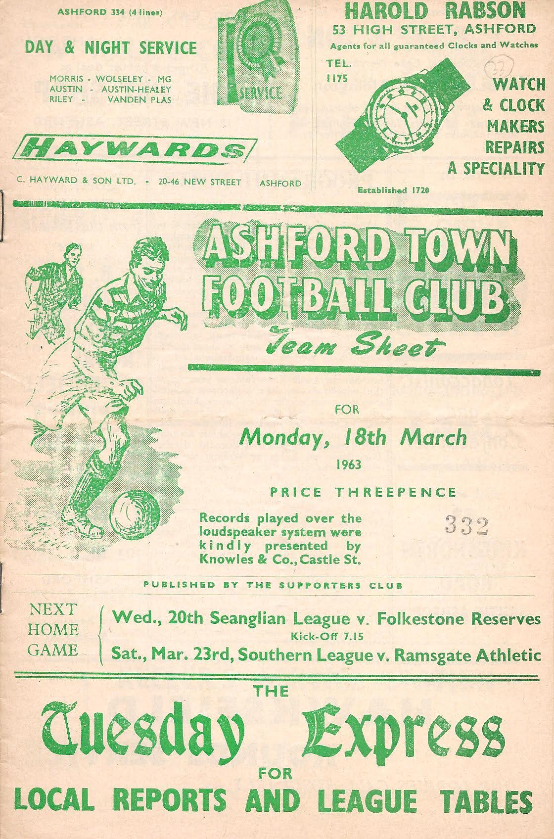 1962/63 18 Mar 1963 Sittingbourne (H) Southern League Division One 2-0 586 Programme