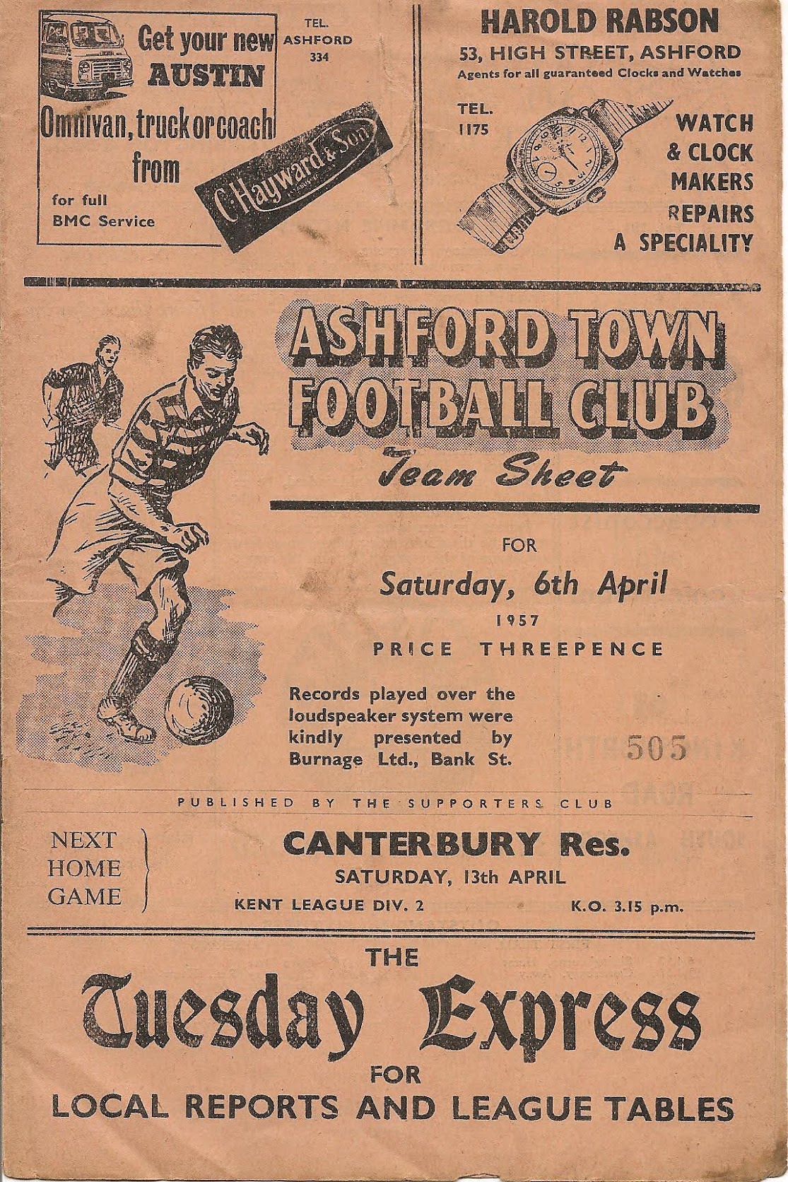 1956/57 06 Apr 1957 Sittingbourne (H) Kent League Division 1 2-1 --- Programme