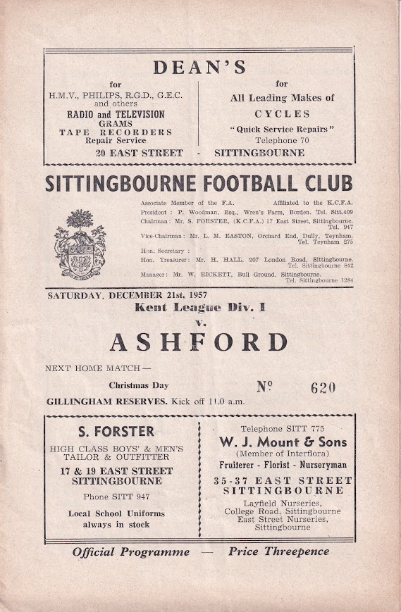 1957/58 21 Dec 1957 Sittingbourne (A) Kent League Division 1 1-1 --- Programme