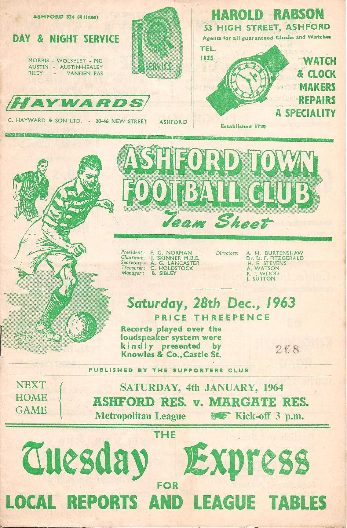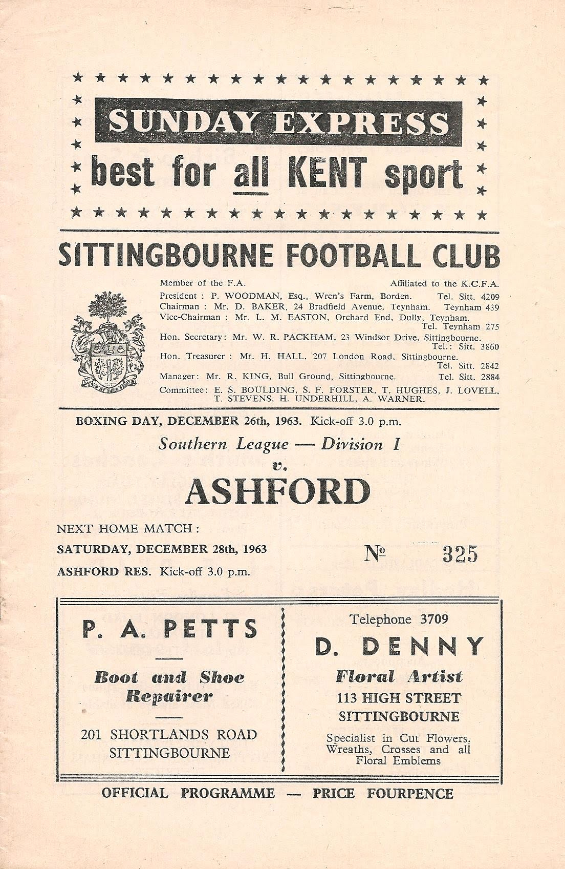 1963/64 26 Dec 1963 Sittingbourne (A) Southern League Division One 1-0 631 Programme