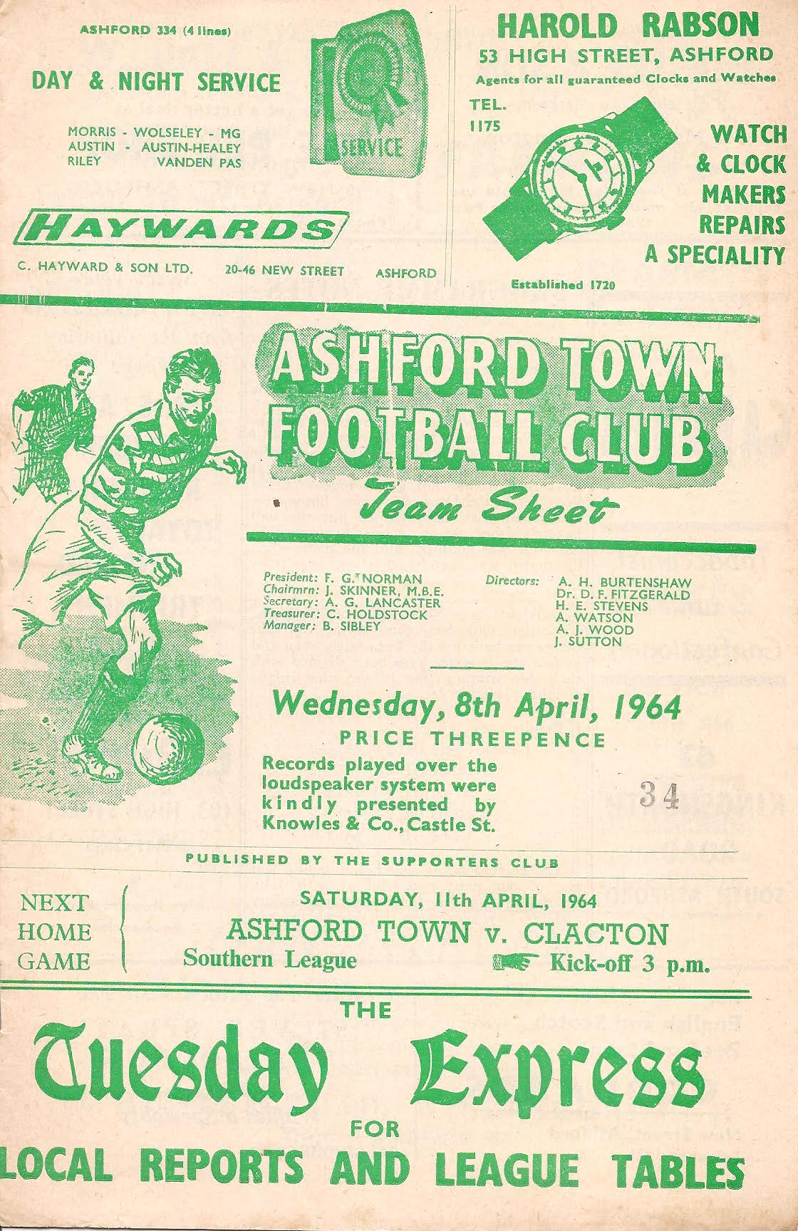 1963/64 08 Apr 1964 Sittingbourne (H) Southern League Division One 1-2 610 Programme