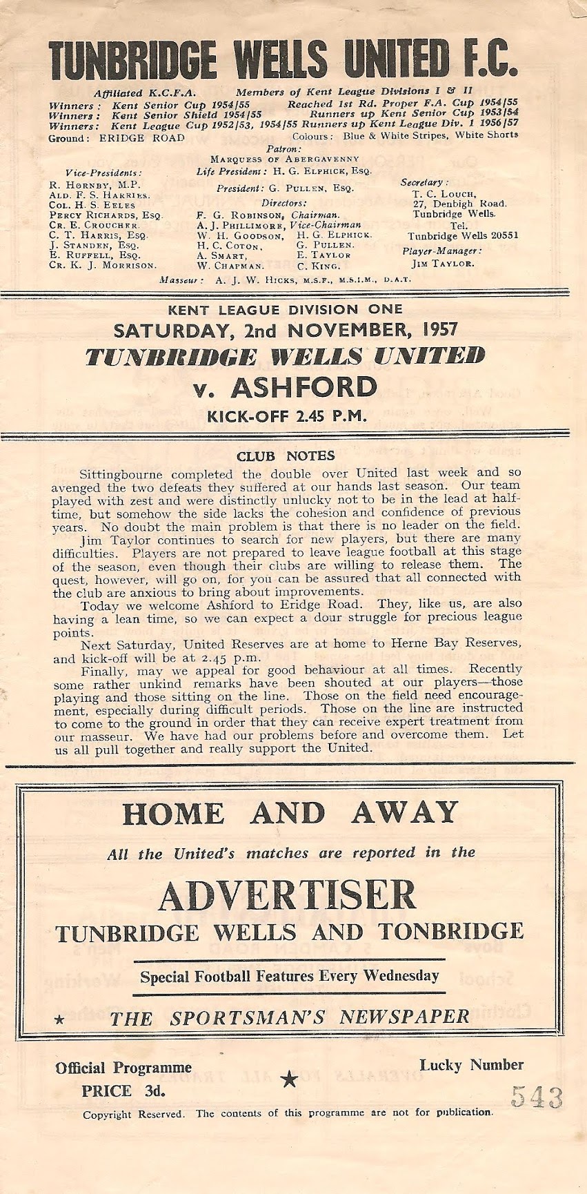 1957/58 02 Nov 1957 Tunbridge Wells United (A) Kent League Division 1 3-3 --- Programme