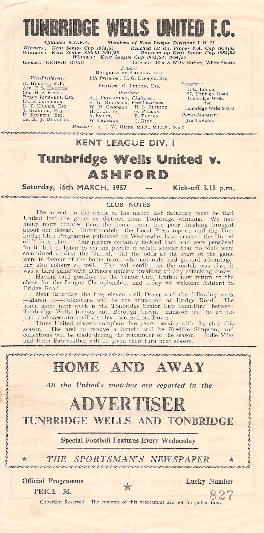 1956/57 16 Mar 1957 Tunbridge Wells United (A) Kent League Division 1 1-4 --- Programme