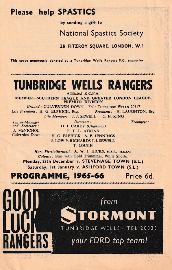 1964/65 20 Mar 1965 Tunbridge Wells Rangers (A) Southern League Division One 1-2 300 Programme