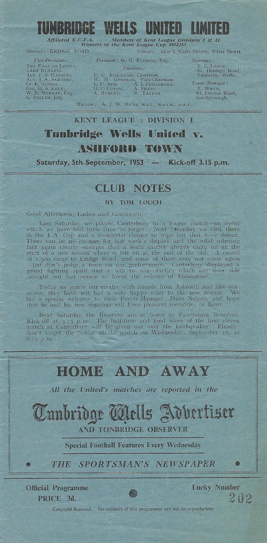 1952/53 06 Sep 1952 Tunbridge Wells United (A) Kent League Division 1 3-3 --- Programme