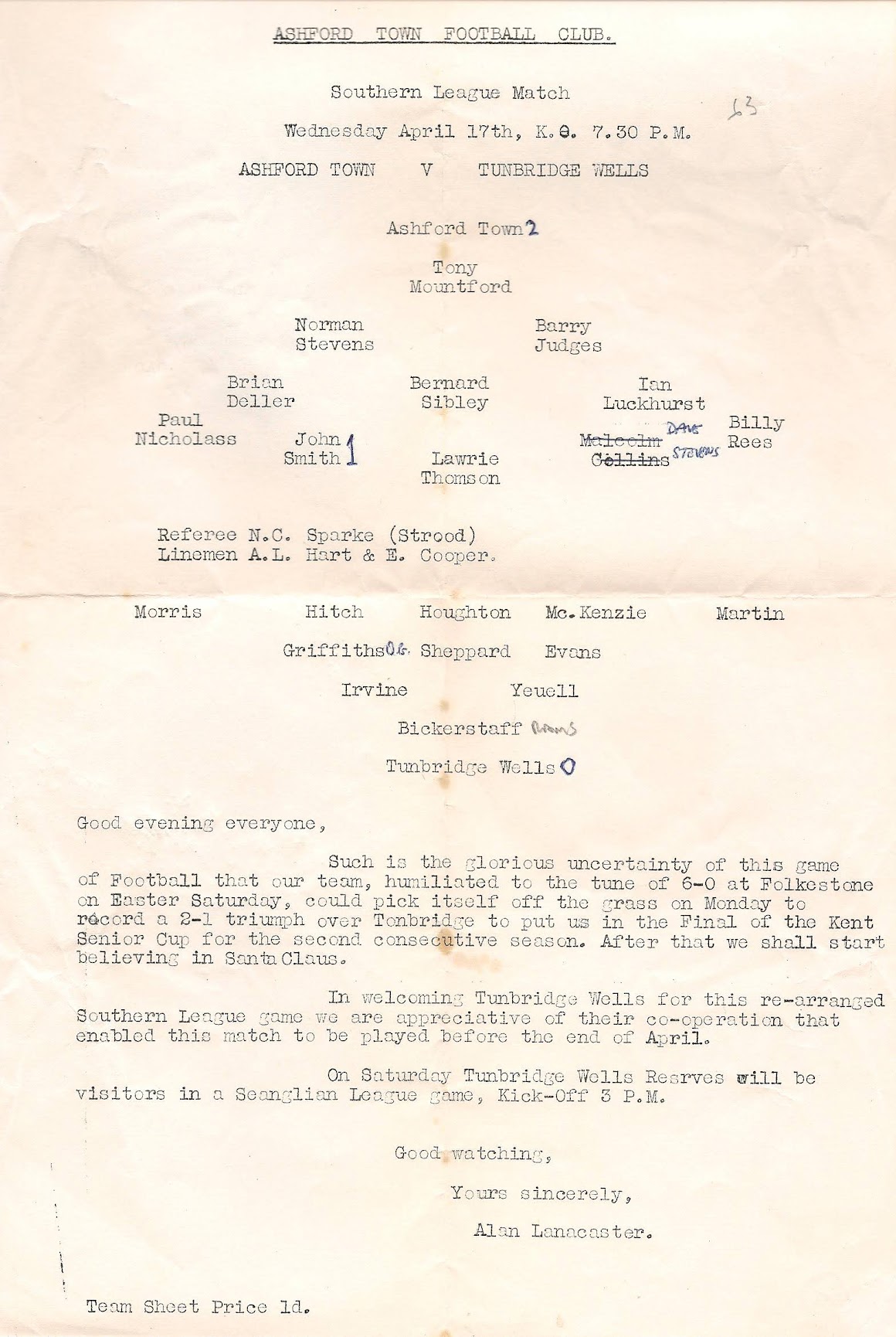 1962/63 12 Apr 1963 Tunbridge Wells United (A) Southern League Division One 3-2 --- Programme