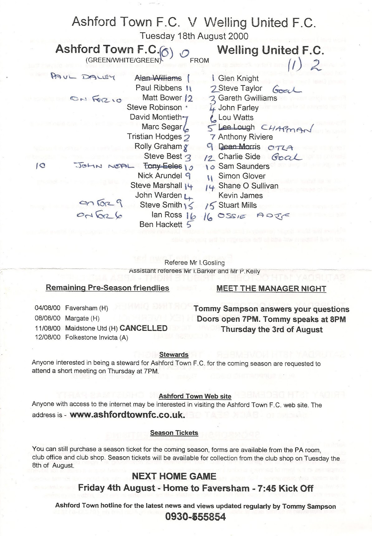 2000/01 18 Aug 2000 Welling United (H) Friendly 0-2 --- Programme