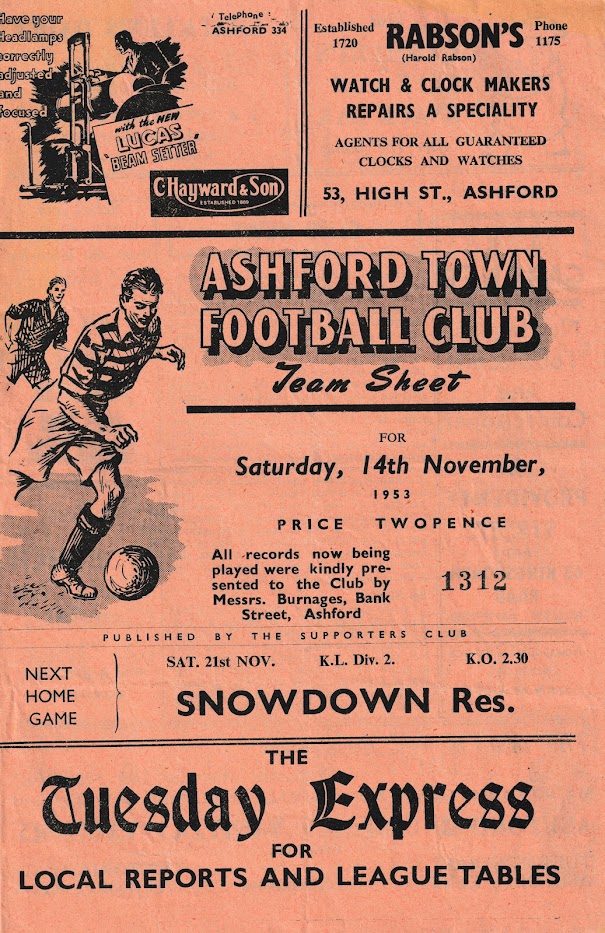 1953/54 14 Nov 1953 Whitstable Town (H) Kent League Division 1 1-1 2,031 Programme