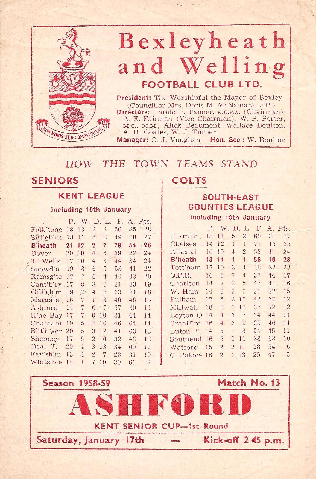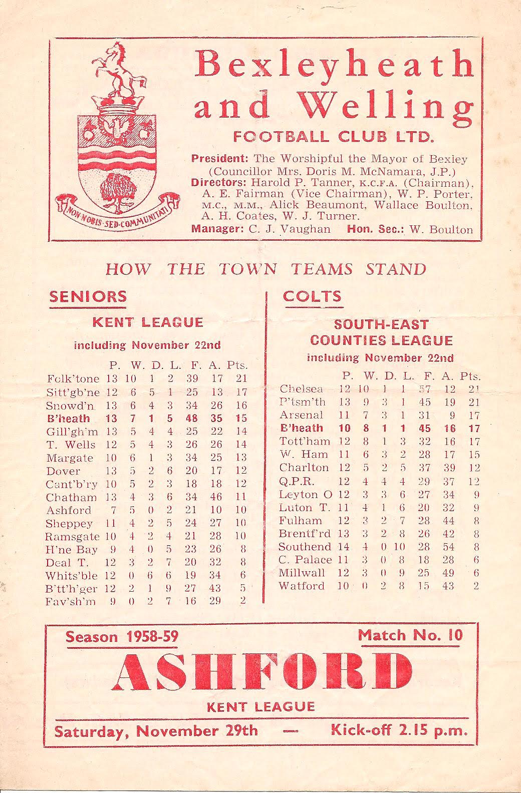 1958/59 29 Nov 1958 Bexleyheath and Welling (A) Kent League Division 1 3-6 1,724 Programme