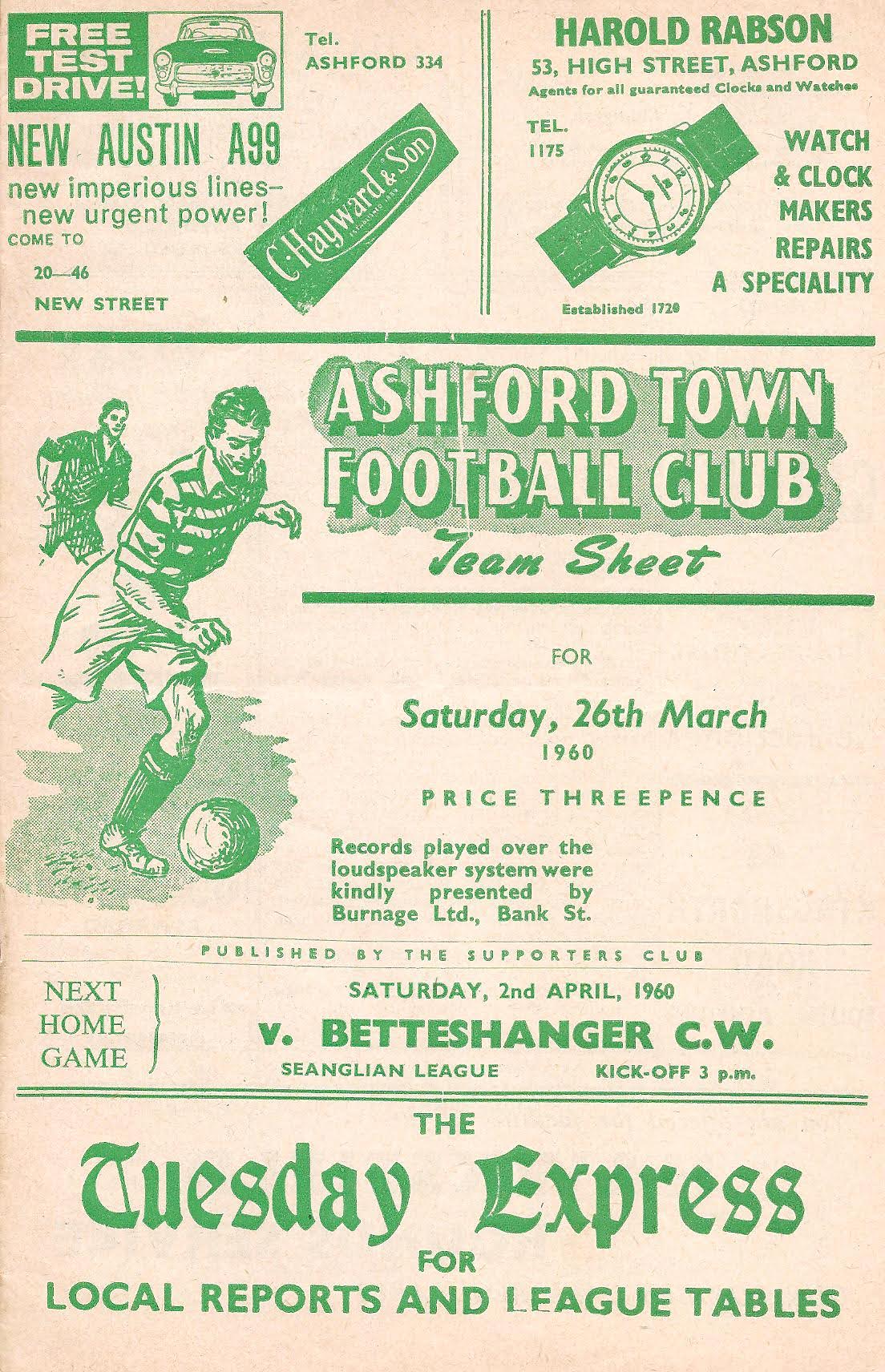 1959/60 26 Mar 1960 Cambridge United (H) Southern League Division One 0-2 1,144 Programme