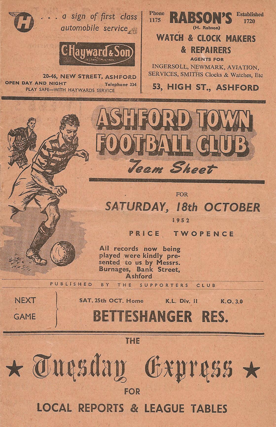 1952/53 18 Oct 1952 Canterbury City (H) Kent League Division 1 5-2 2,596 Programme