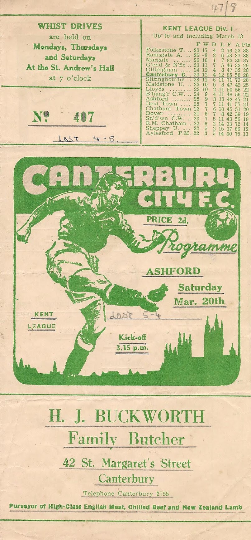 1947/48 20 Mar 1948 Canterbury City (A) Kent League Division 1 5-4 2,000 Programme