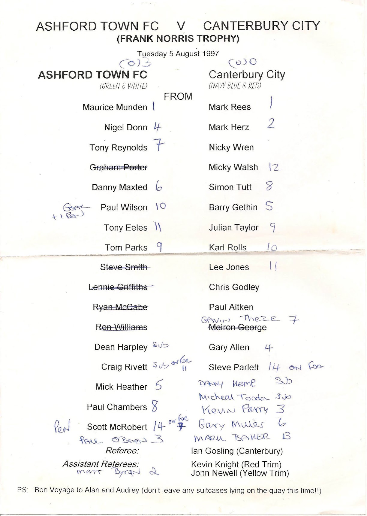 1997/98 05 Aug 1997 Canterbury City (H) Frank Norris Trophy 3-0 --- Programme