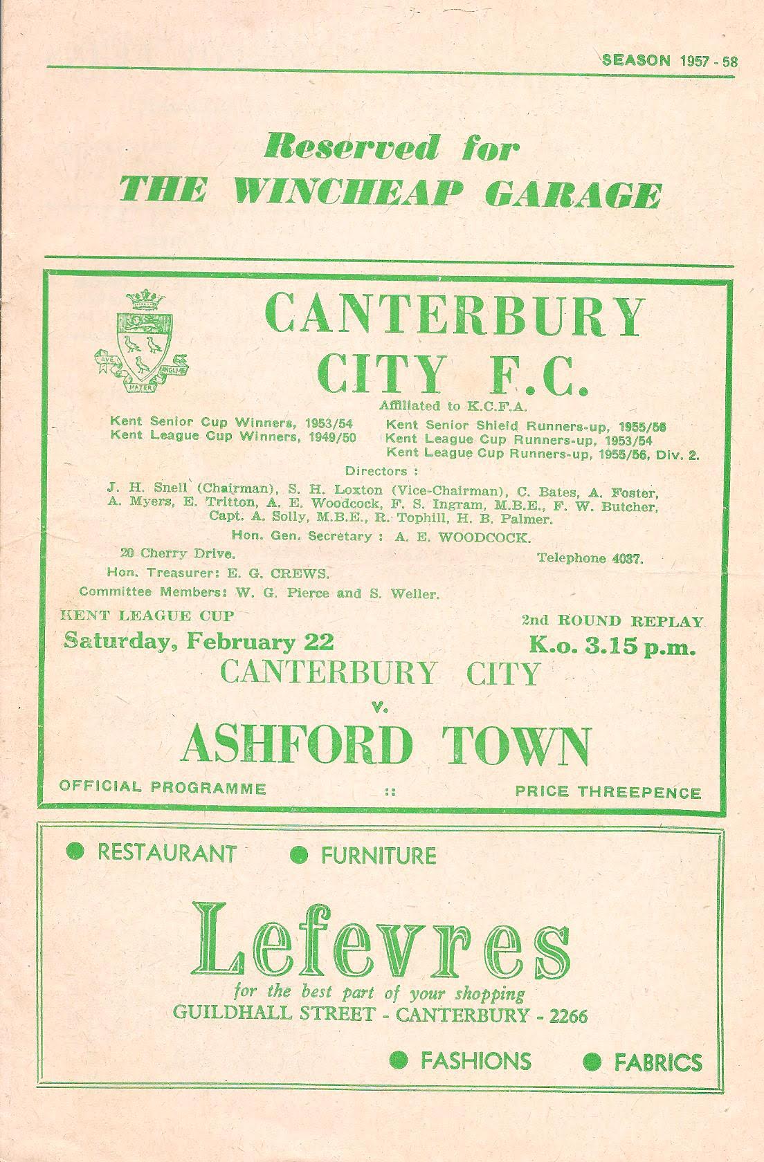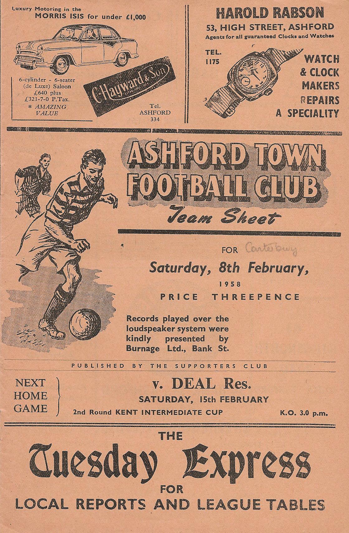 1957/58 08 Feb 1958 Canterbury City (H) Kent League Cup 1-1 --- Programme