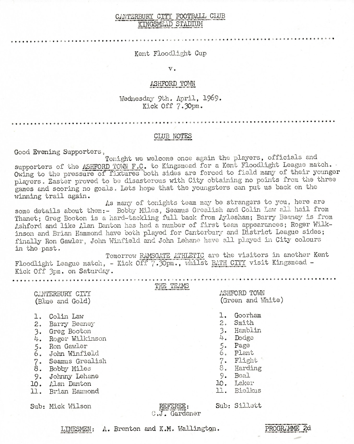 1968/69 09 Apr 1969 Canterbury City (A) Kent Floodlight Cup 1-0 129 Programme