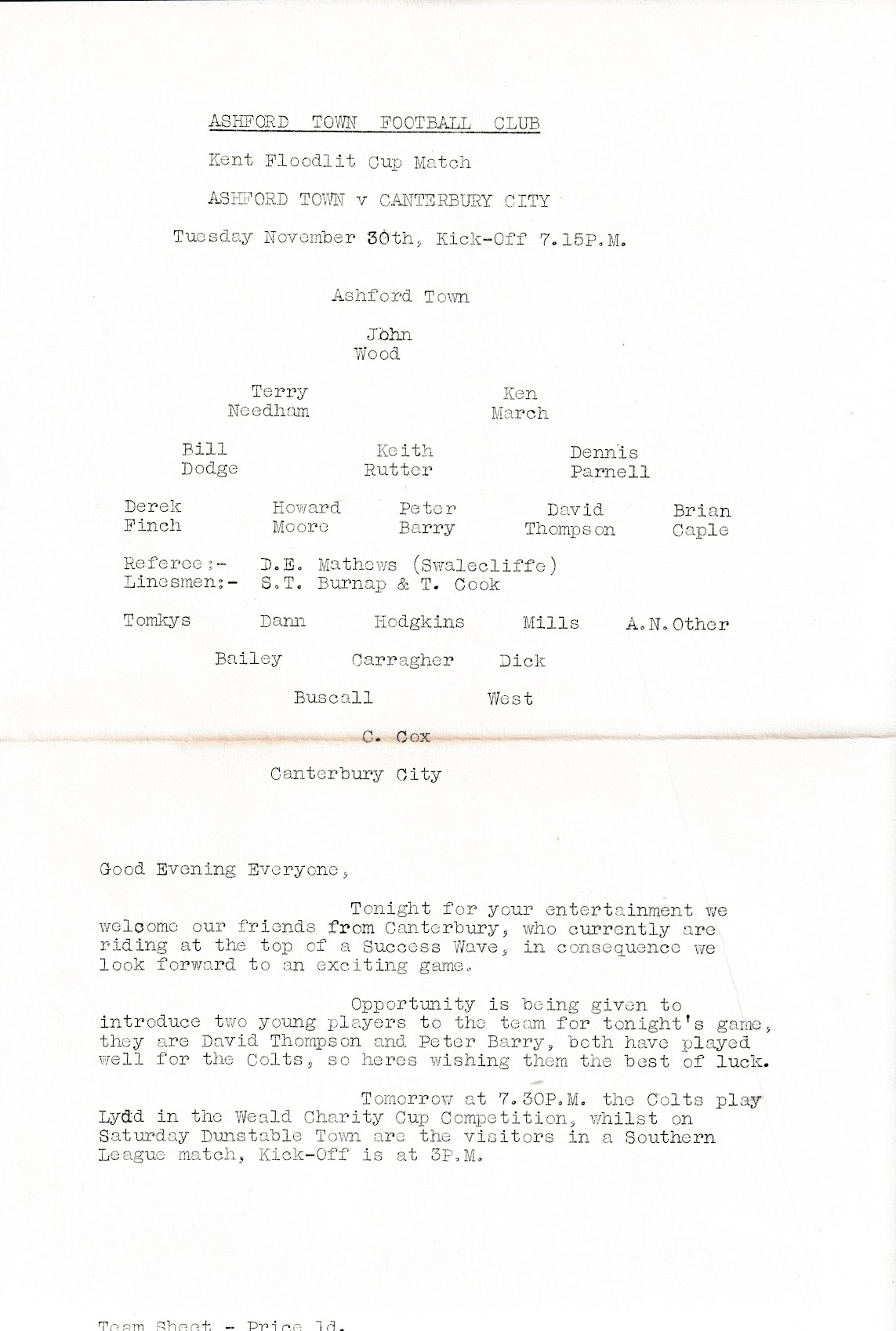 1964/65 15 Dec 1964 Canterbury City (A) Kent Floodlight League 1-3 450 Programme