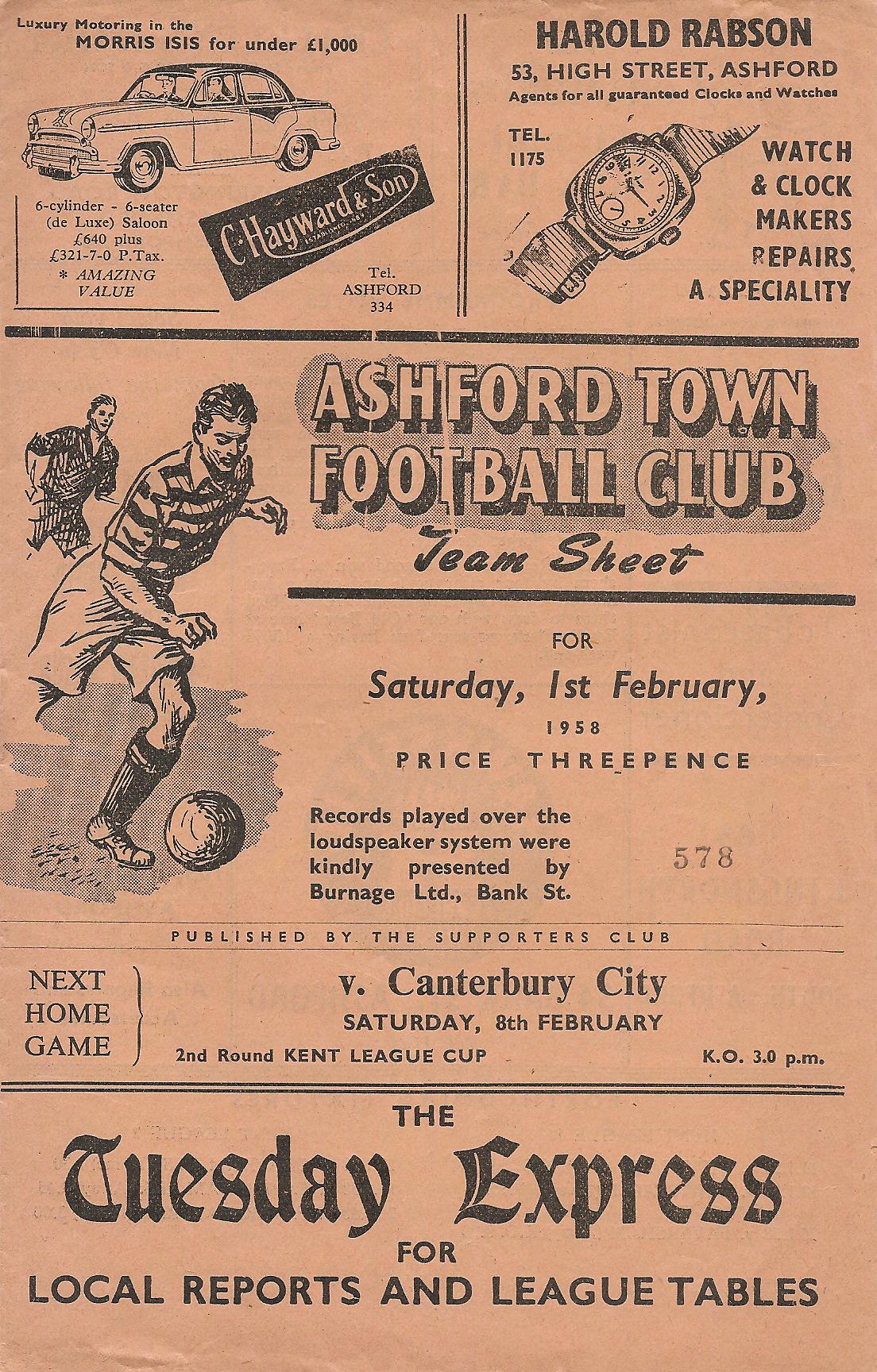 1957/58 01 Feb 1958 Canterbury City (H) Kent League Division 1 1-1 --- Programme