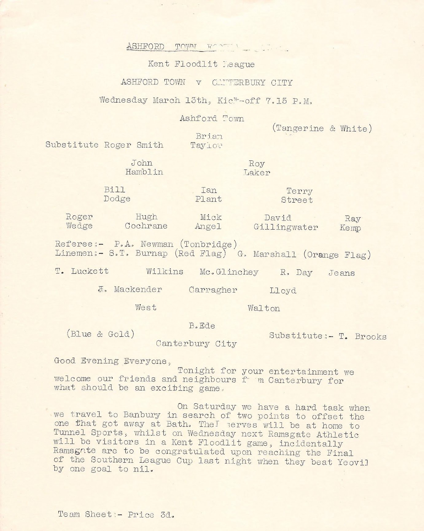 1964/65 15 Feb 1965 Canterbury City (H) Kent Floodlight League 2-1 424 Programme