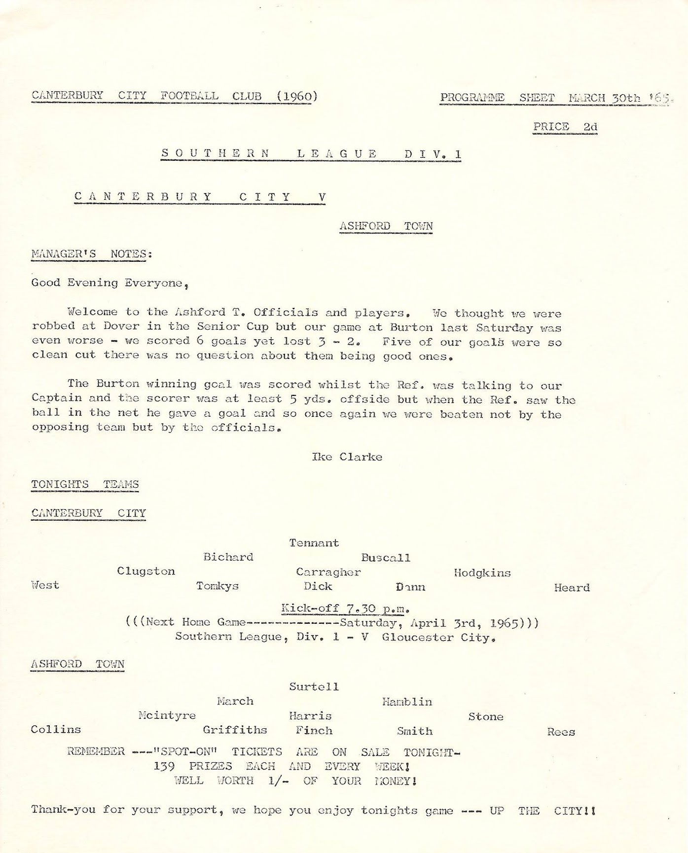 1964/65 30 Mar 1965 Canterbury City (A) Southern League Division One 1-4 --- Programme